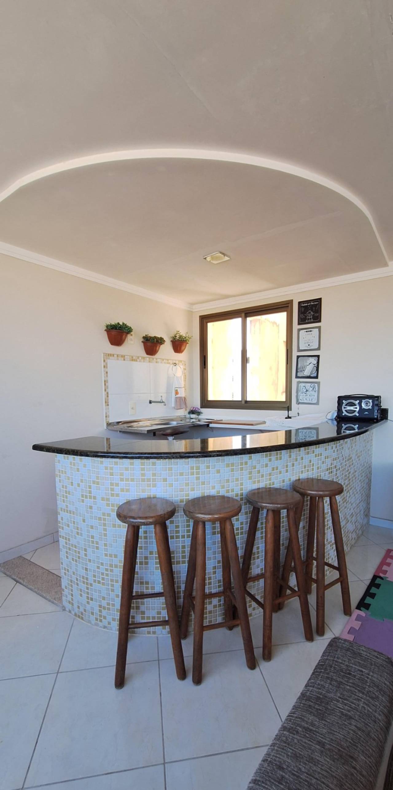 Contém bancada em granito e acabamento em pastilhas.