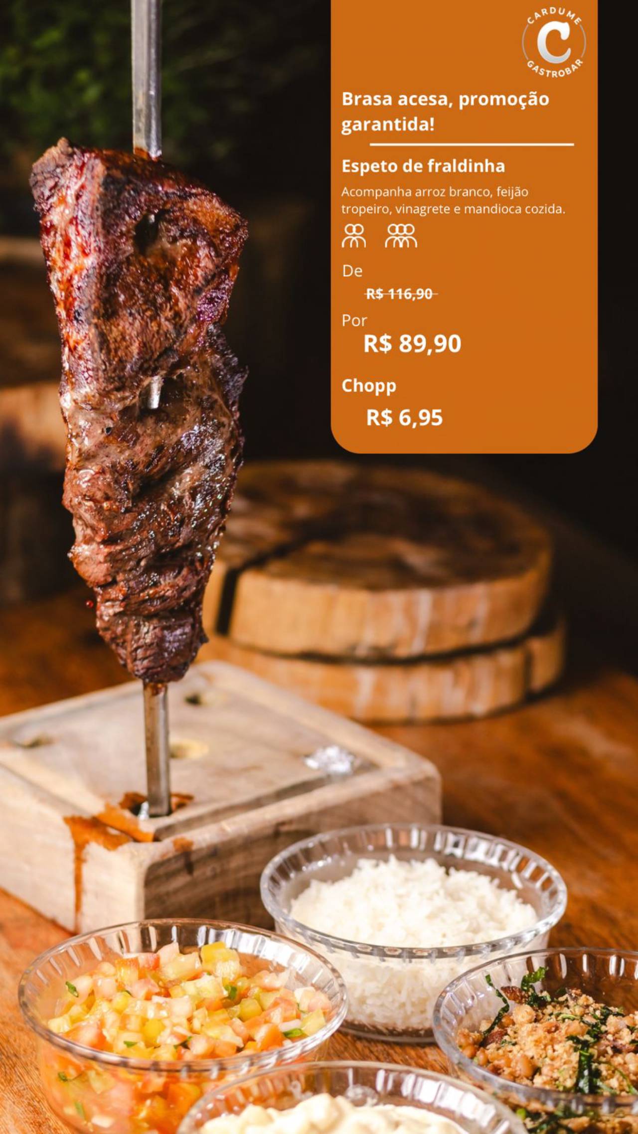 Brasa acesa e promoção garantida! Nesta quinta, o Espeto de Fraldinha é a estrela do Cardume Gastrobar, em Mineiros. Venha curtir aquele sabor suculento, clima descontraído e a melhor experiência da cidade. Quinta boa é quinta no Cardume!