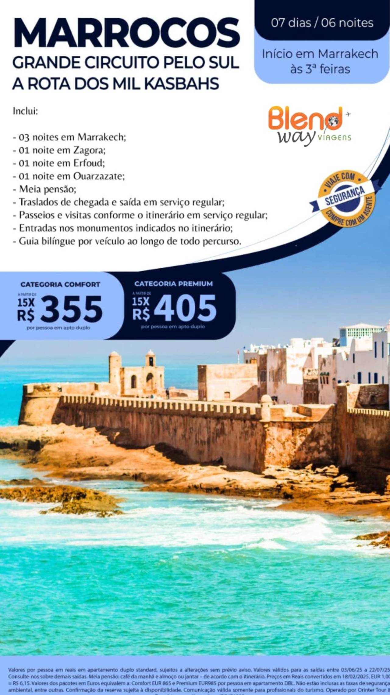 Descubra o encantador Marrocos com o "Grande Circuito pelo Sul", uma viagem que explora as belezas do deserto e as cidades históricas do país. O roteiro oferece uma imersão na cultura marroquina, com conforto e guias especializados para uma experiência completa. Viaje por paisagens deslumbrantes e conheça a verdadeira essência do Marrocos. Informamos que os valores e a disponibilidade mencionados estão sujeitos a alterações. Para obter informações atualizadas e precisas, por favor, entre em contato com a Blend Way Viagens em Mineiros.