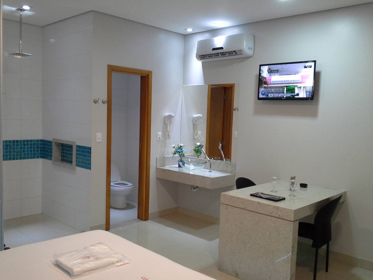Suíte com canais eróticos, ar-condicionado, ducha, frigobar, garagem automática e TV.