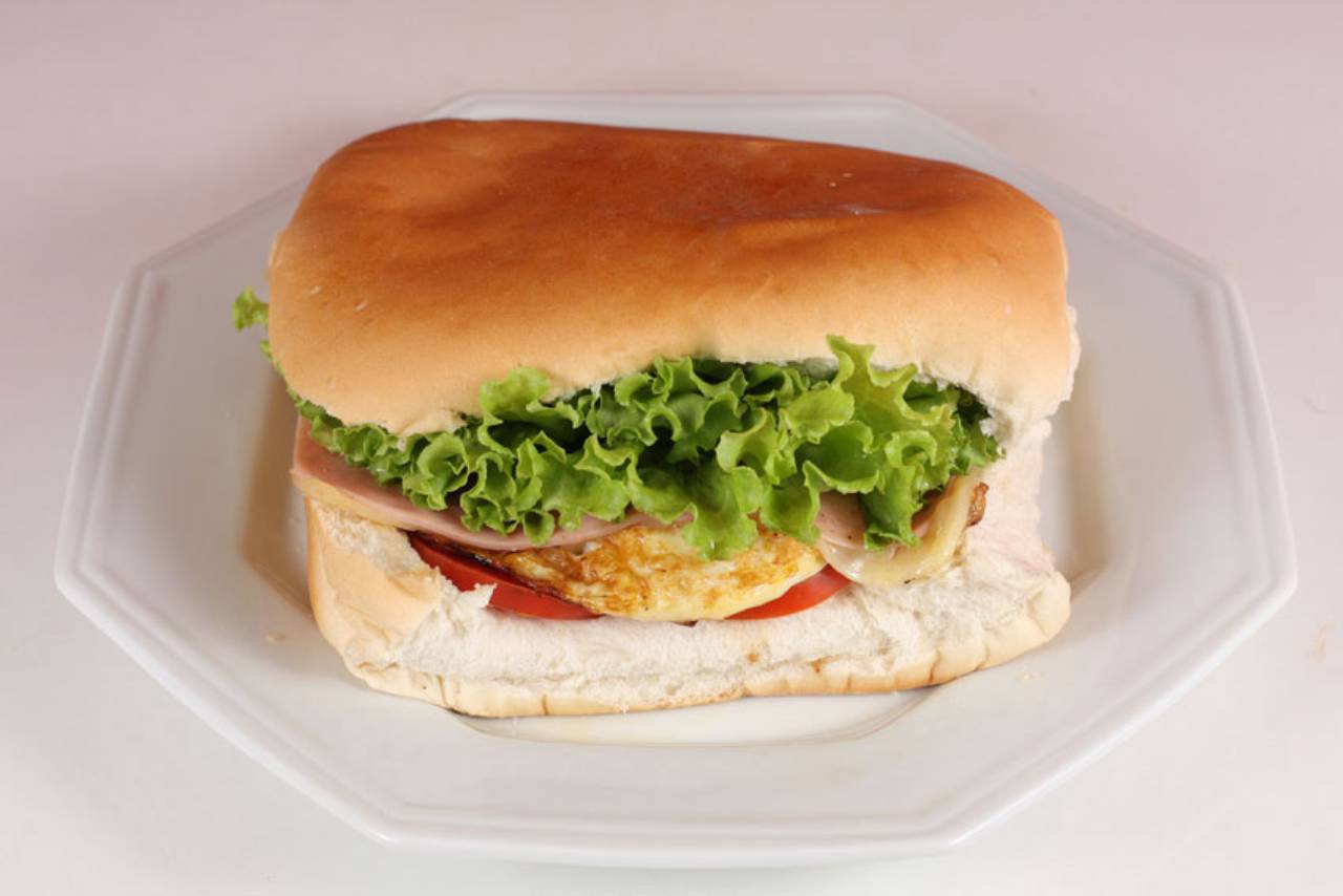 Pão, presunto, queijo, ovo, tomate, alface, milho, batata palha