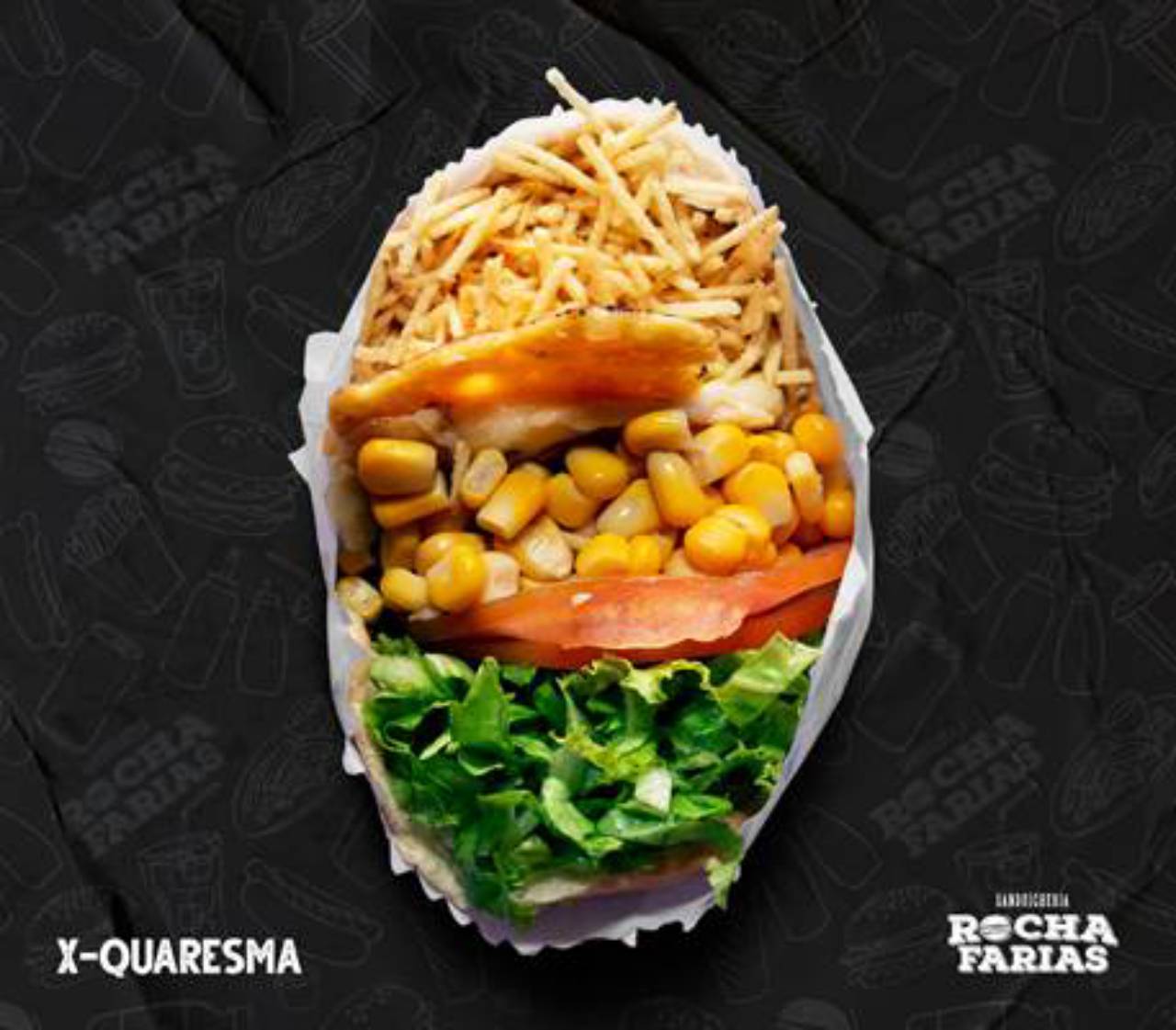 Pão, 02 ovos, mussarela, milho, batata palha, alface e tomate.