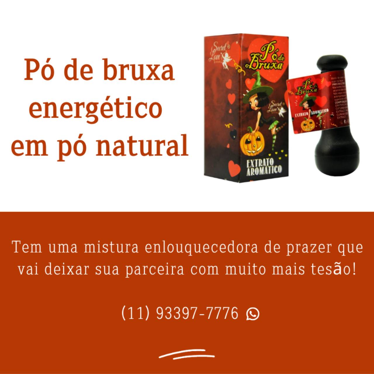 O PÓ DE BRUXA, realmente faz “mágica”, com ingredientes energéticos 100% natural é uma mistura enlouquecedora de prazer que vai deixar sua parceira(o) com muito mais tesão, criando a mistura perfeita para uma noite de amor com muito mais fogo e intensidade.