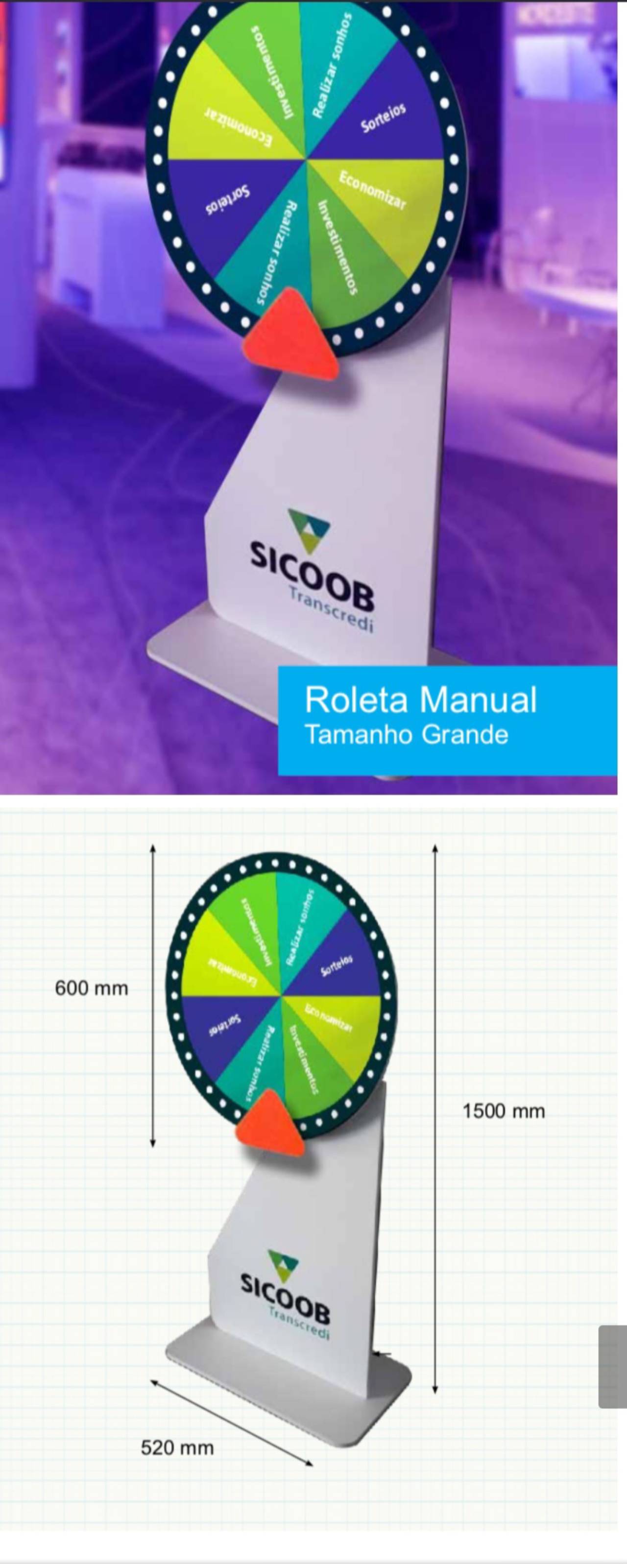 - Adesivação e Customização: A roleta pode ser totalmente adesivada e personalizada com a sua marca, cores e prêmios específicos, proporcionando uma experiência única e alinhada à sua identidade visual.