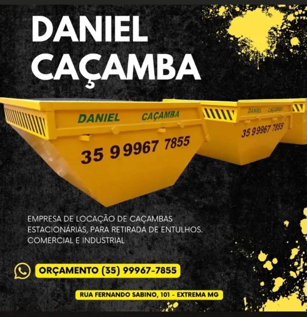 A Daniel Caçambas oferece a solução ideal para a remoção eficiente de resíduos em eventos e feiras em Extrema, MG. Nossas caçambas estacionárias garantem um ambiente limpo e organizado, facilitando a coleta de lixo gerado por grandes públicos. Com atendimento ágil e cumprimento das normas ambientais, proporcionamos uma gestão sustentável dos resíduos, contribuindo para a preservação da cidade e o sucesso do seu evento.