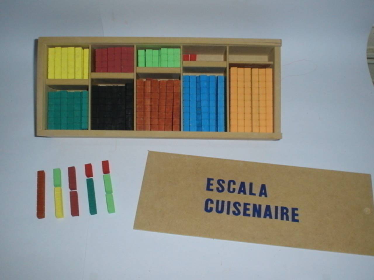 Ref. 004 - BARRAS DE CUISENAIRE G - Matéria-Prima: Madeira e MDF - Caixa: 36cm x 15cm x 9cm, contendo: 360 peças. Objetivo: Compreensão e correlação de tamanhos, correspondência de quantidade, operações matemáticas e reconhecimento de novas cores. A partir dos 04 anos.