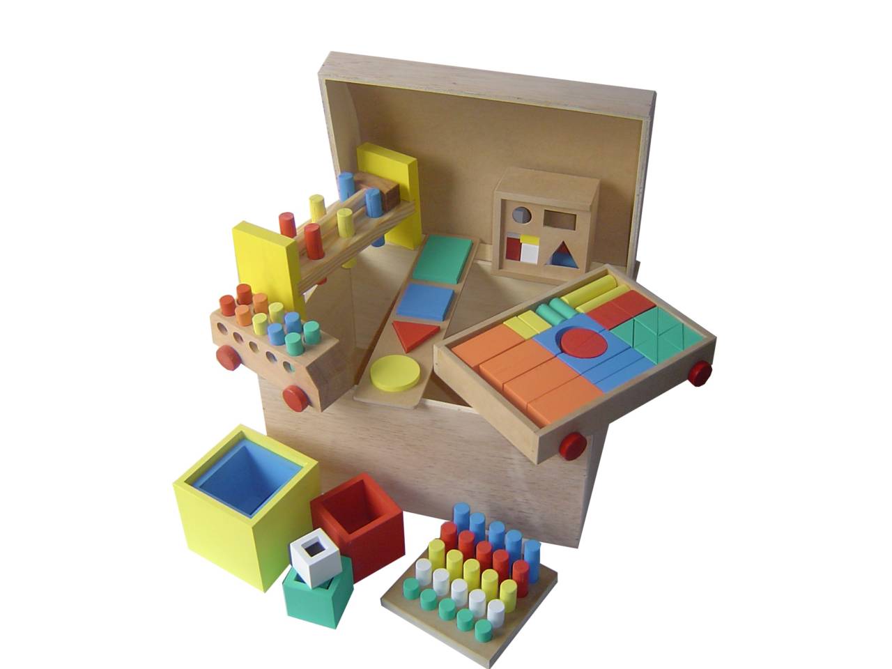 Ref. A-24 - BAÚ PEDAGÓGICO COM 10 BRINQUEDOS - Matéria-Prima: Bloco, MDF e Madeira - Mede: 39cm de Comp. X 31cm de Larg. X 27cm de Alt. Contém: 10 brinquedos (01 BALANÇA Ref. 045; 01 BARRA DE FIGURAS GEOMÉTRICAS DE ENCAIXE Ref. 042; 01 BATE-PINOS Ref. 046; 01 CARRO DE BLOCOS Ref. 057; 01 CILINDROS NO QUADRADO Ref. 052.1; 01 CUBOS DE ENCAIXE Ref. 062; 01 MOSAICO Ref. 083; 01 ÔNIBUS COM PINOS Ref. 088; 01 PASSA PASSA CAIXA Ref. 089 e 01 RELÓGIO Ref. 098)