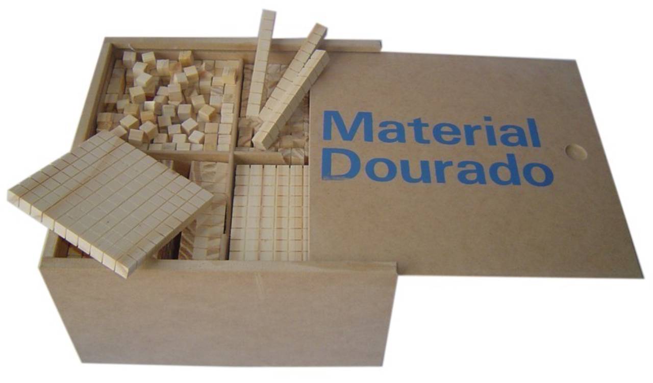 Ref. 016.1 - MATERIAL DOURADO - Materia-Prima: Madeira Pinus e MDF - Caixa: 23cm x 23cm x 13cm. Contendo: 611 peças, sendo: 1 cubo (milhar), 10 placas (centenas), 100 prismas (dezenas), 500 cubos (unidades). Objetivo: Iniciação ao sistema decimal de numeração. A partir dos 06 anos.