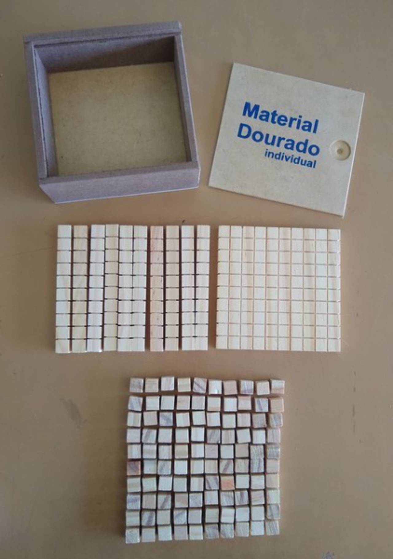 Ref. 016.2 - MATERIAL DOURADO INDIVIDUAL – Matéria-Prima: Madeira Pinus e MDF. Medidas: 33cm x 12cm x 3,5cm. Peças: 111 peças (1 placa-centena, 10 barras-dezenas, 100 cubos-unidades). Objetivo: Iniciação ao sistema decimal de numeração. A partir dos 06 anos.