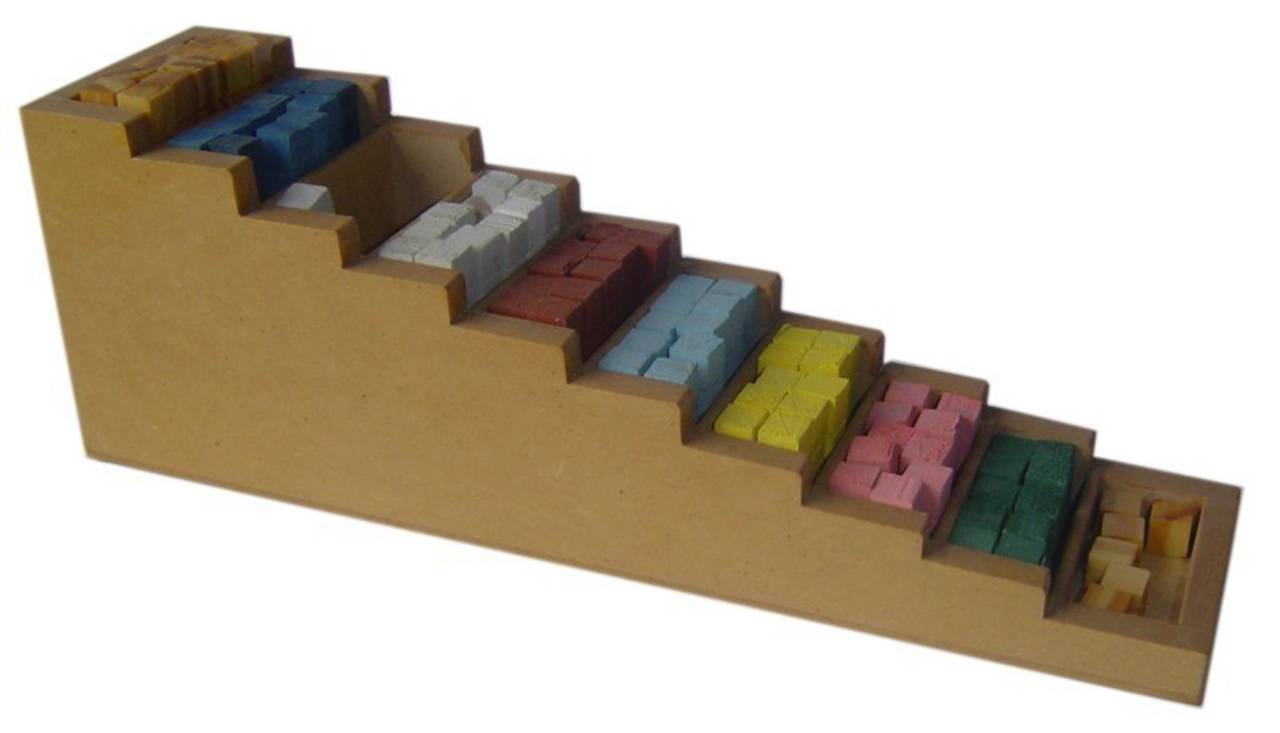 Ref. 018.1 - MATERIAL SEMI-SIMBÓLICO P - Caixa: 29,5cm x 10cm x 7cm, contendo: 100 barras (10 de cada, da unidade até a dezena). Objetivo: Fixam os conceitos de numeração e das operações, prepara para as obstruções. A partir dos 06 anos.