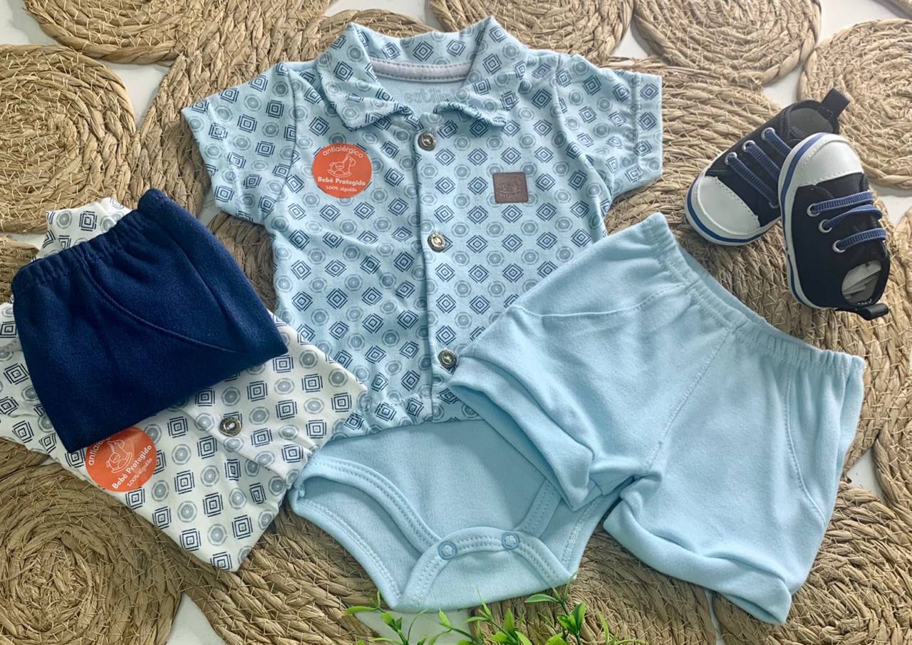 Body azul com gola polo para bebê conjunto Estilinho