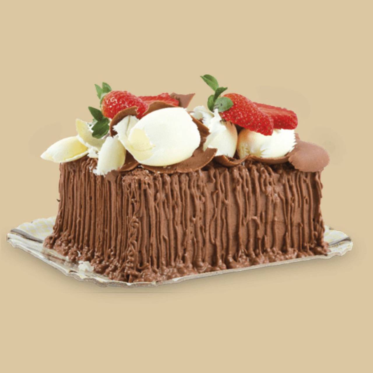 Bolo de massa de chocolate, recheio de mousse de chocolate com morangos e cocada, cobertura de mousse de chocolate preto, raspas de chocolate preto e branco e morangos (decorativos).