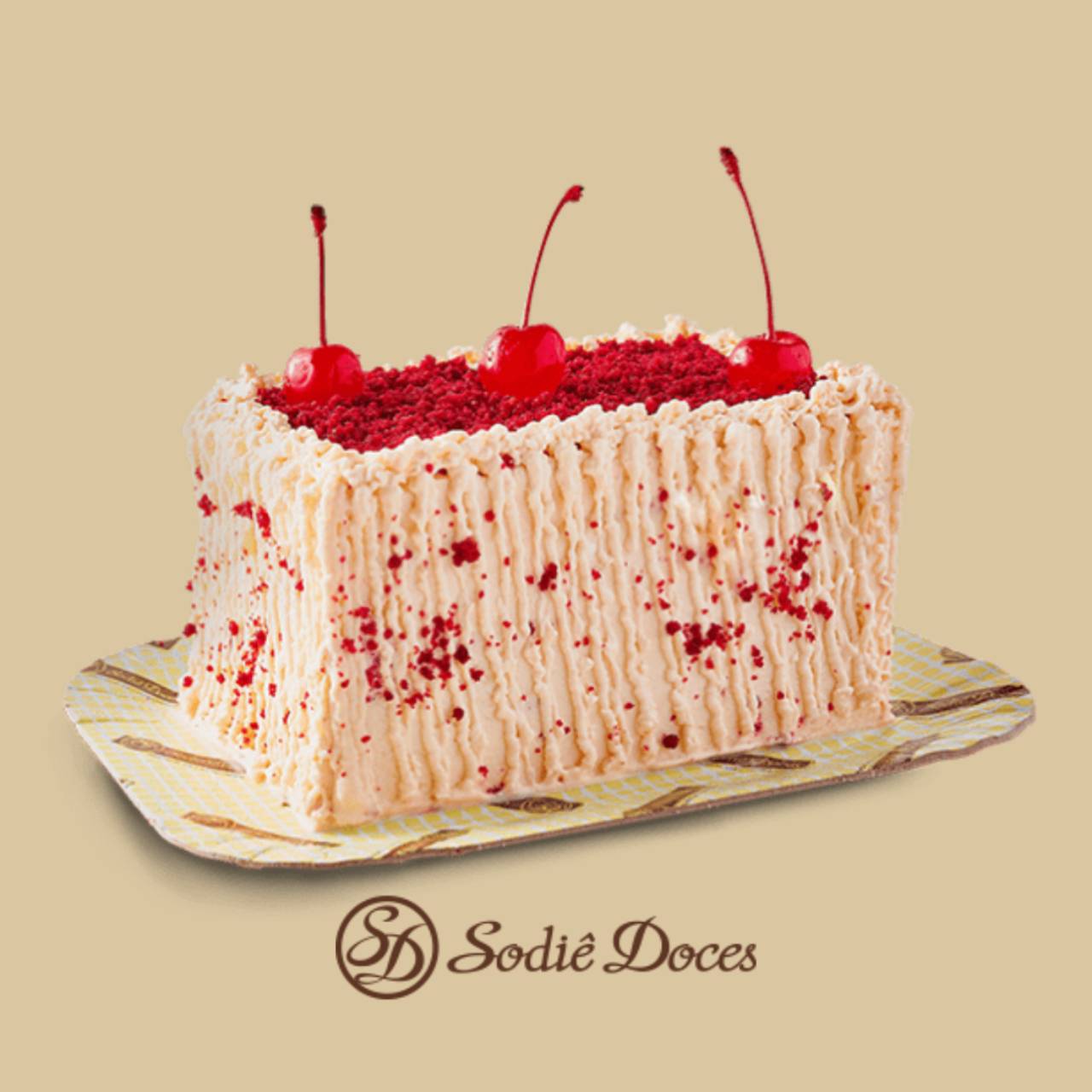 Bolo de massa red velvet, recheios de mousse de cream cheese, cobertura de mousse branca, massa red velvet e cerejas decorativas.
