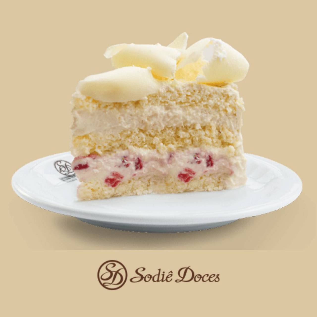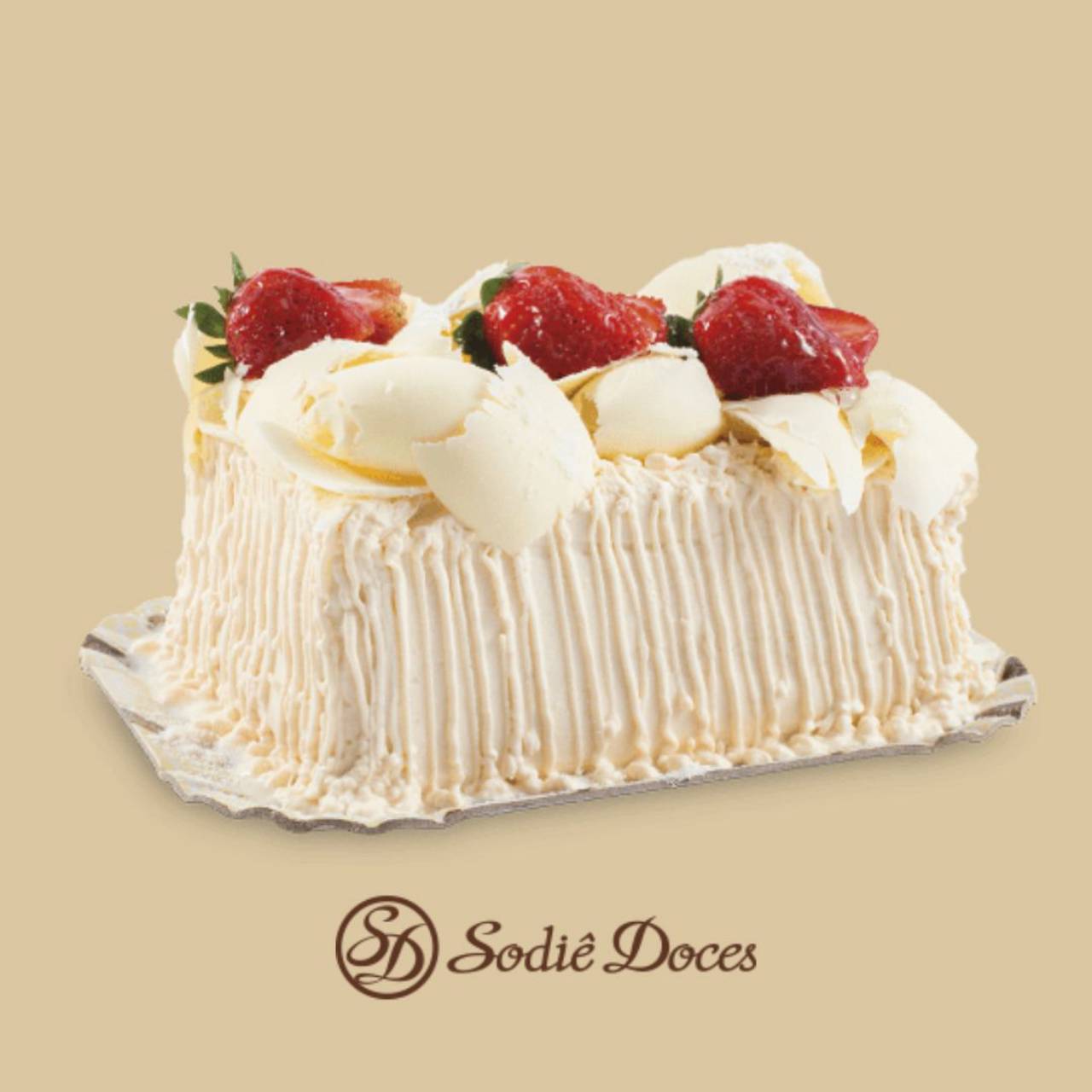 Bolo de massa branca, recheio de mousse de leite em pó com morango e mousse de leite em pó, cobertura de mousse branca, raspas de chocolate branco, leite em pó e morangos.