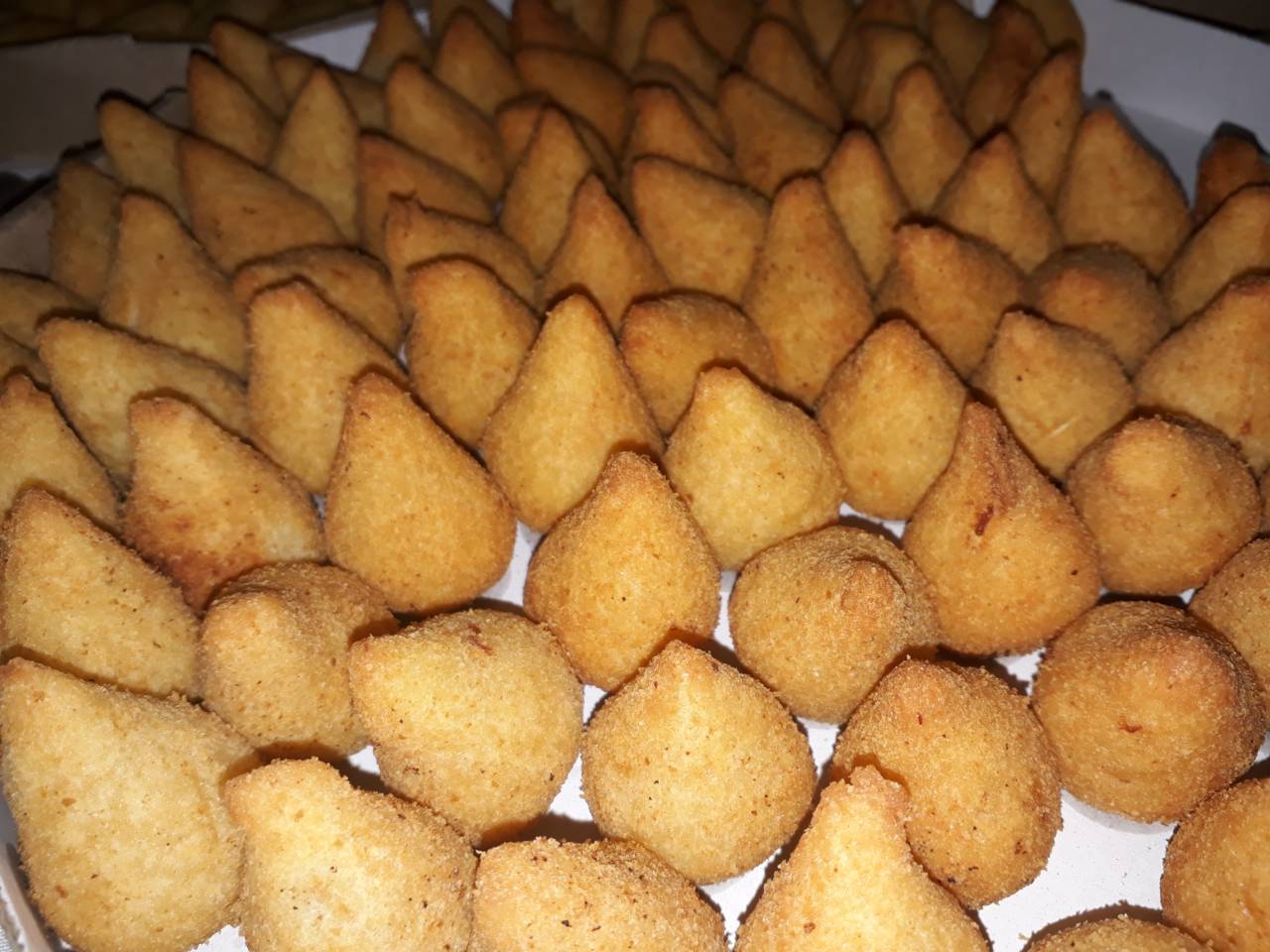 Cento de coxinha de frango crocante. Massa especial e frango temperado com produtos naturais e caseiros. Os salgadinhos de festas mais crocantes da cidade.