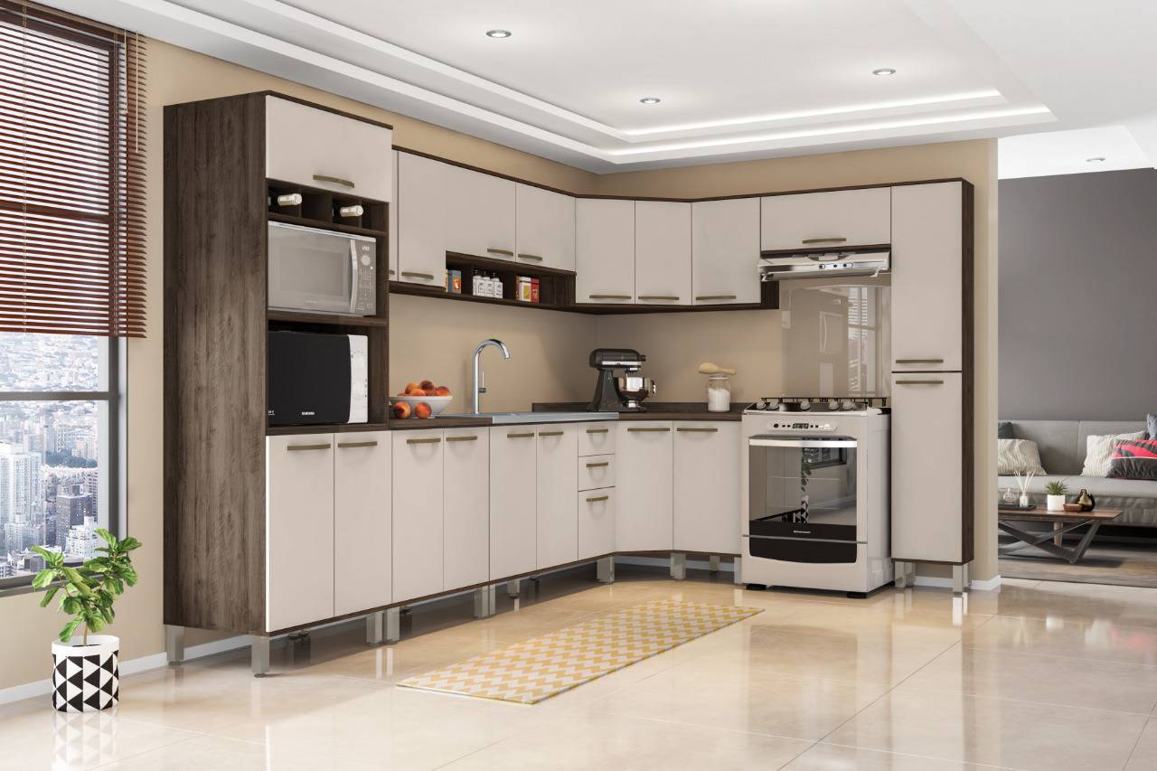 Cozinha completa e modulada. Disponível cor PEROLA com madeira.