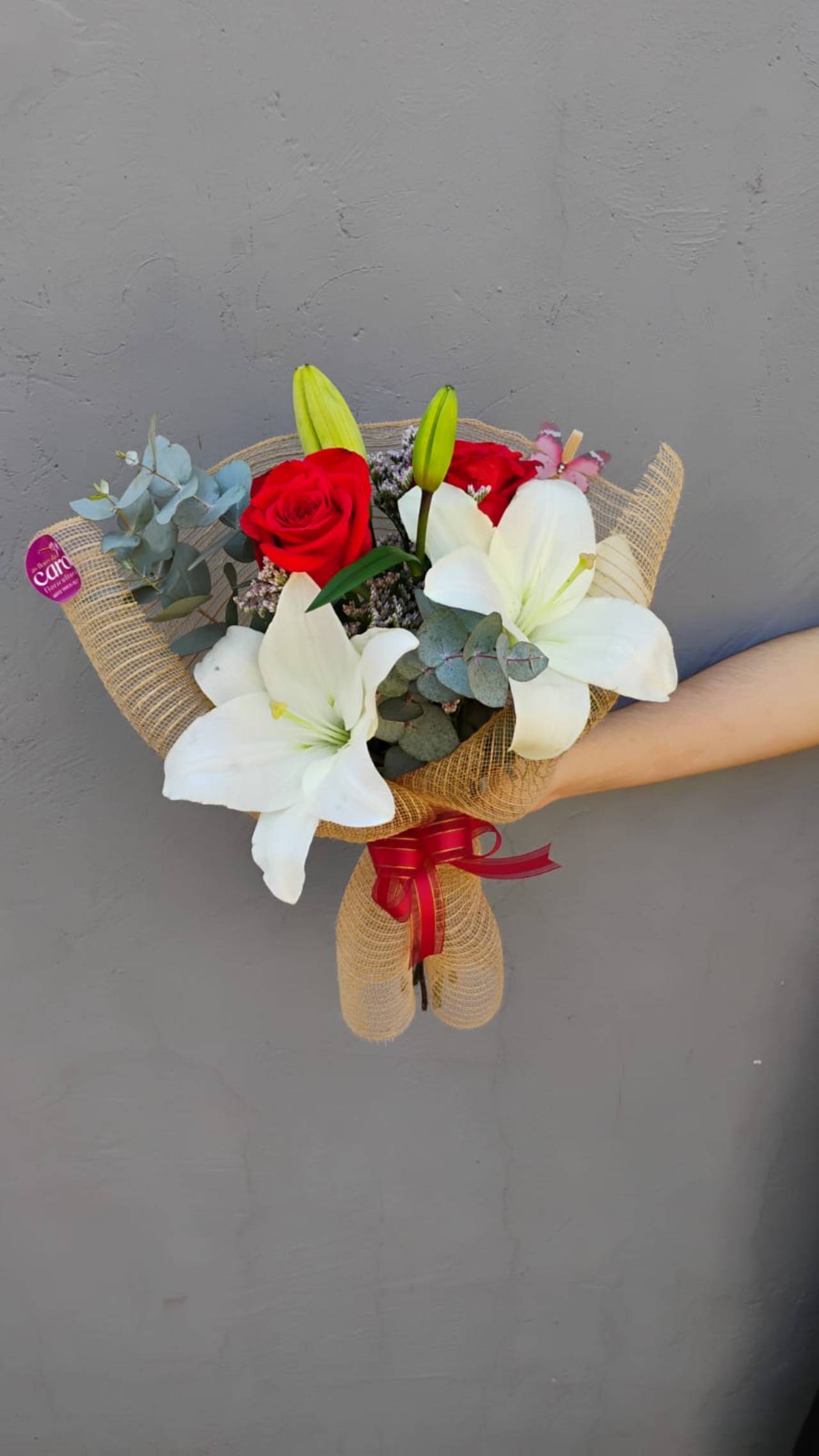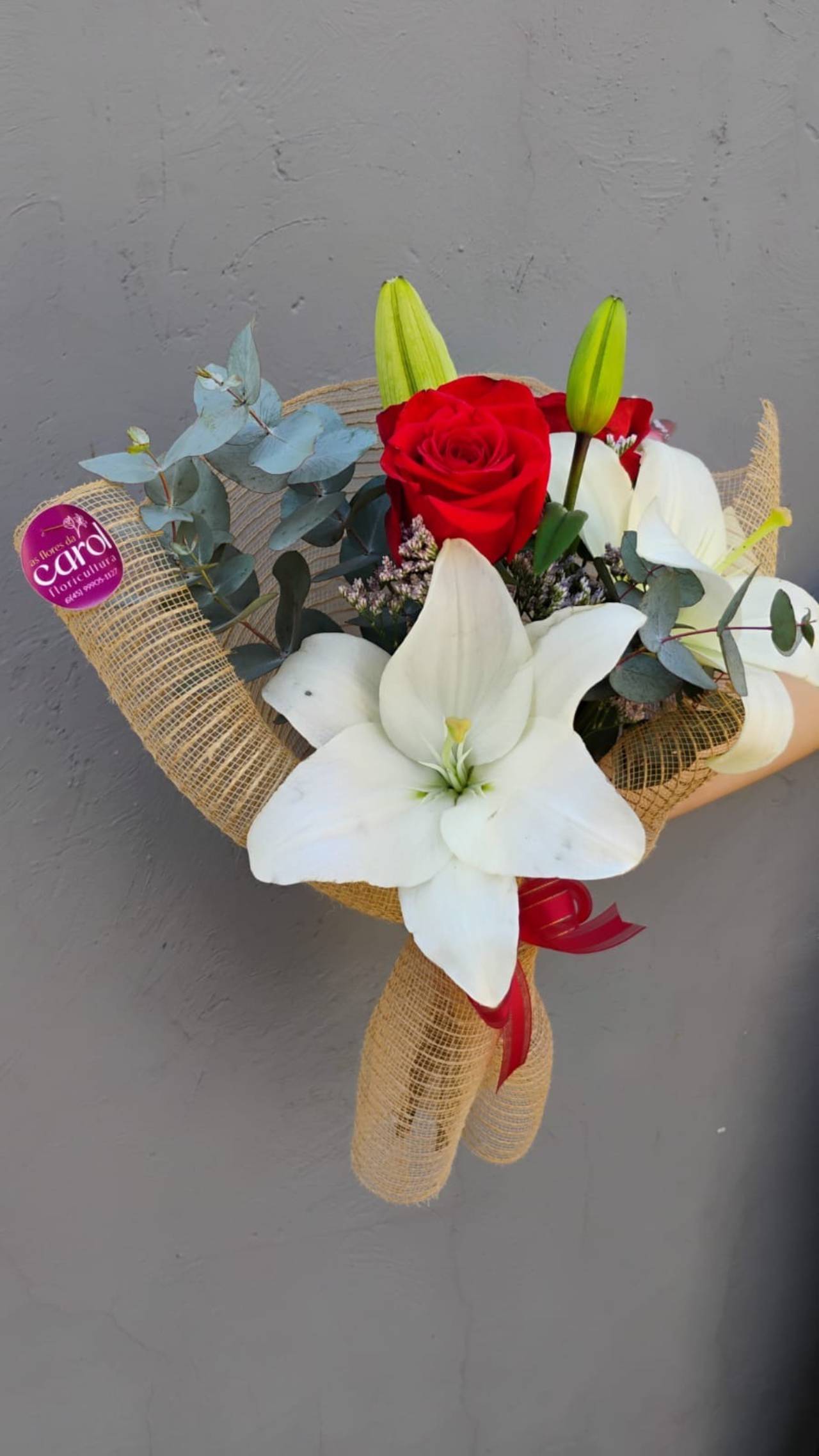 Composição de Lírio Branco e Rosa Vermelha Importada.