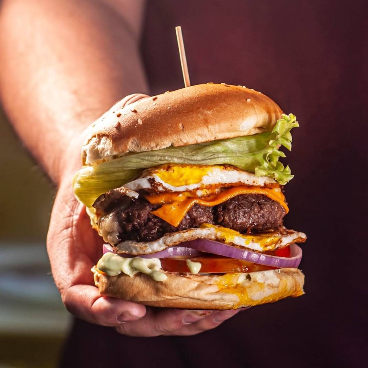 Pão de Hambúrguer, nosso famoso Hambúrguer especial de 120gr, molho Green, 2 ovos, Queijo Muçarela, Cheddar's, Presunto, Cebola roxa, Alface e Tomate