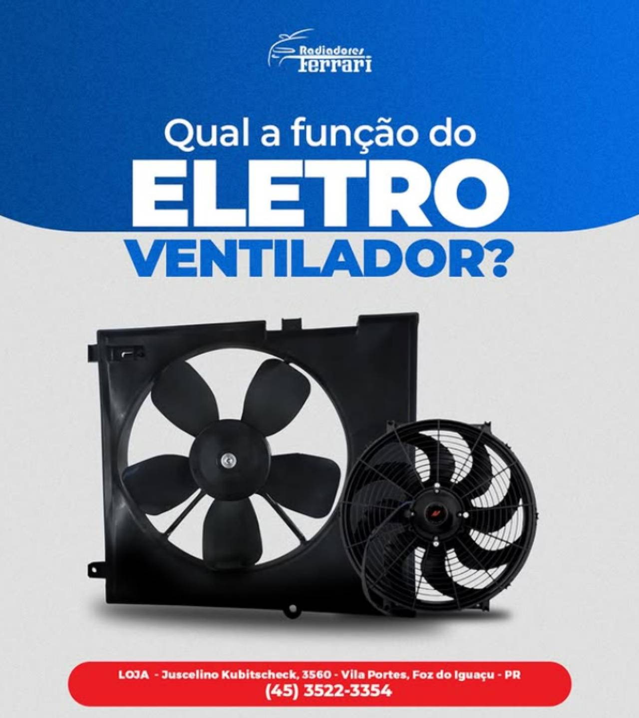 Na Radiadores Ferrari, você encontra o eletroventilador, um componente essencial para o sistema de arrefecimento automotivo. Responsável por auxiliar na dissipação do calor gerado pelo motor, o eletroventilador garante o funcionamento eficiente do radiador e mantém a temperatura ideal do veículo, evitando superaquecimentos.
