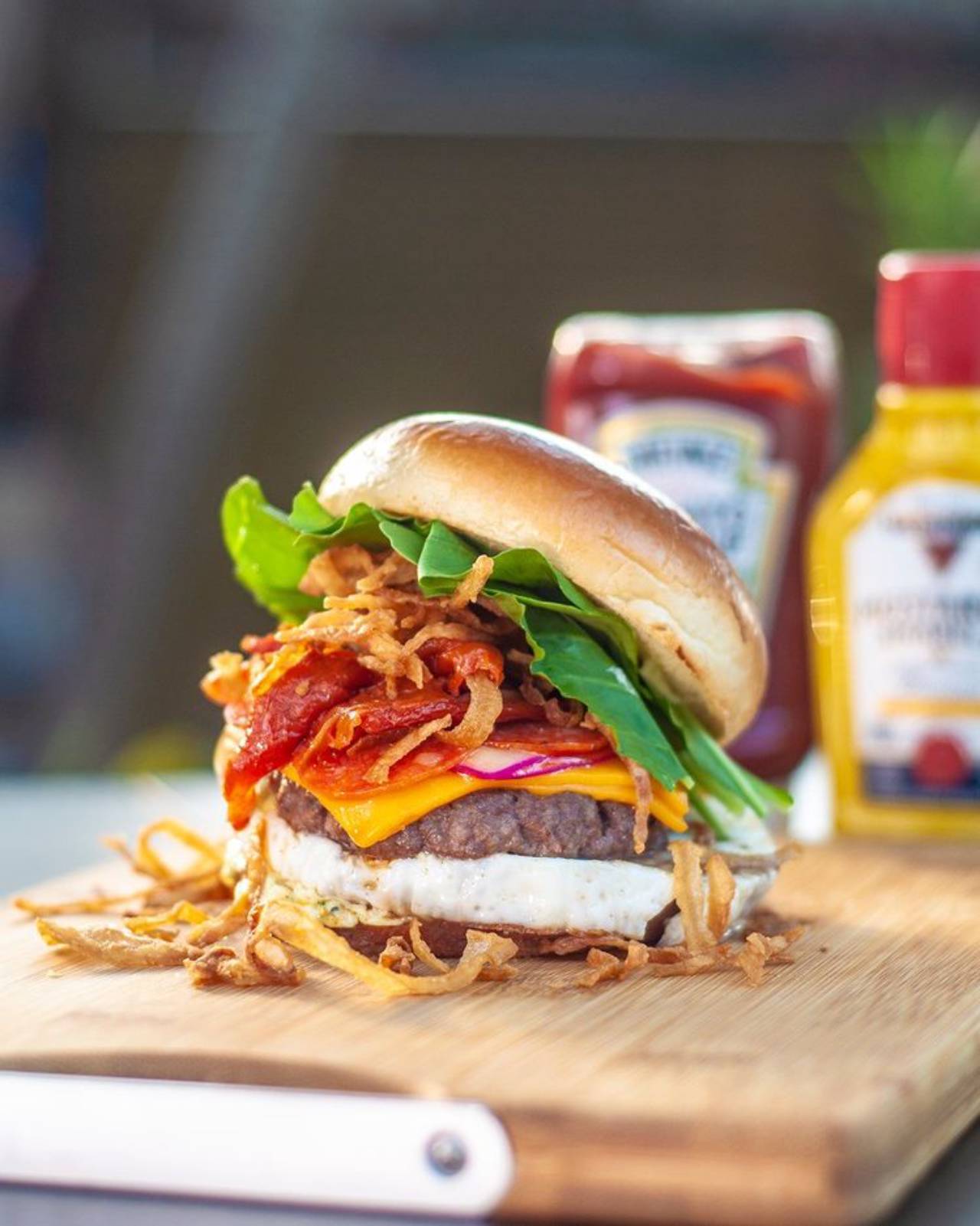 Pão de brioche, o já amado e adorado hambúrguer especial 120g green happy, molho green, fatias de pepperoni picante, ovo, tomate seco, queijo gouda e cheddars, cebola crispy e rúculas fresquinhas.