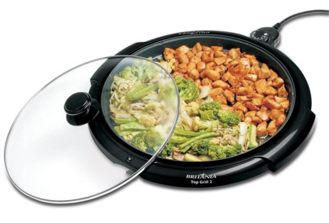 1350W=110V 1200W=220V PEDIR 220V ASSIST. TECNICA BICICLETARIA IGUAÇU GARANTIA= 1 ANO NUMERO= 3574-5055 Dados Técnicos: Altura (mm) 130 Profundidade (mm) 445 Largura (mm) 425 Garantia de 1 ano Peso do Produto (kg) 3,10 Potência (W) 1300 (127V) e 1300 (220V) Características: Prepara diversos tipos de alimentos de forma prática e saudável: Ideal para alimentos grelhados e Teppan Yaki Aquece, assa, tosta, gratina e grelha Seletor de temperaturas destacável: Permite o ajuste adequado para cada tipo de alimento, e possibilita que o aparelho seja levado a mesa Chapa ondulada antiaderente e removível: Evita que o alimento grude e facilita a limpeza Sistema removível de regulagem de temperatura: Permite o ajuste adequado para cada tipo de alimento, e possibilita que o aparelho seja levado a mesa Abertura para escoamento da gordura Bandeja coletora de gordura Tampa transparente em vidro temperado: Resistente e fácil de limpar Base desmontável Luz indicadora de funcionamento Disponível em 127V e 220V Garantia de 1 ano
