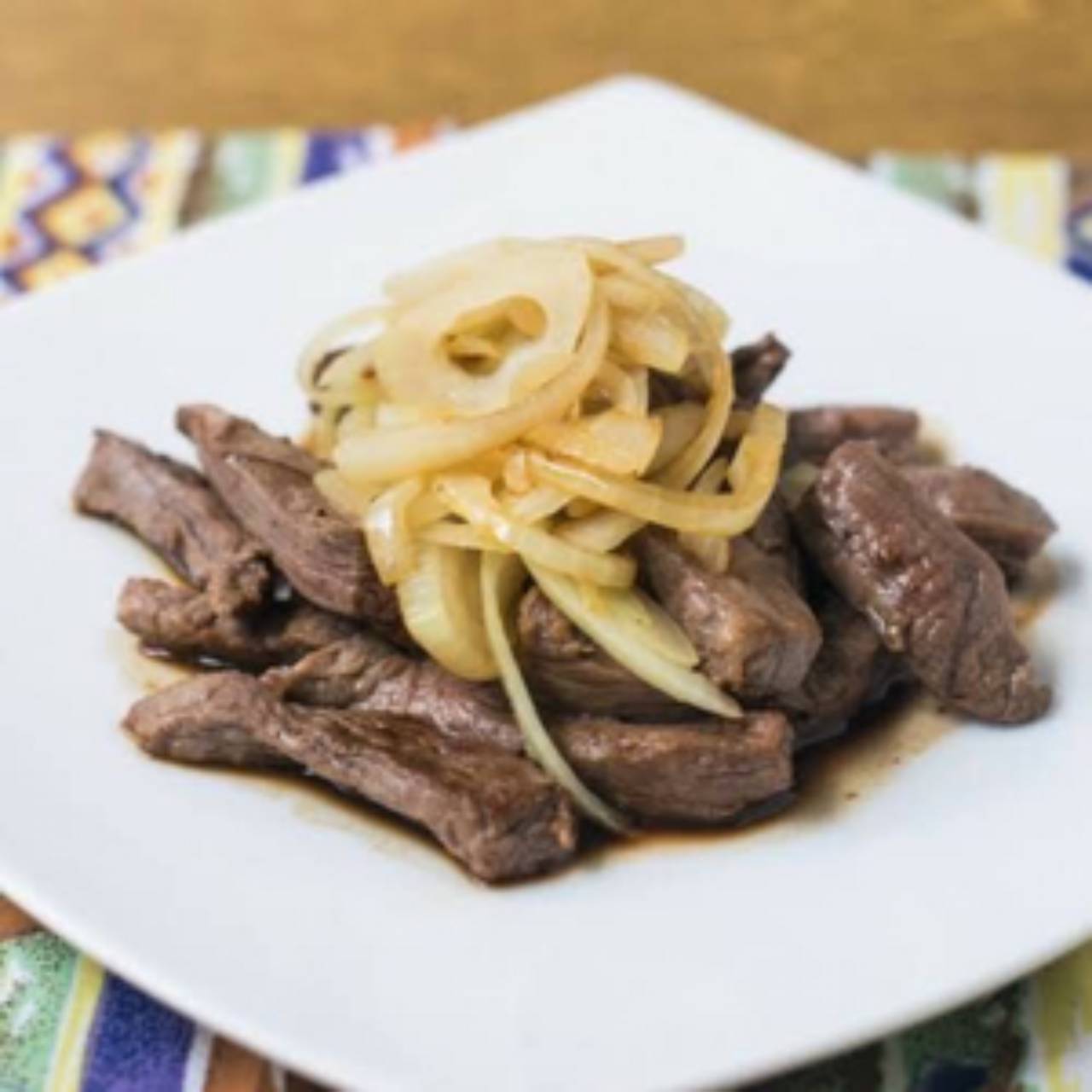 Porção de cubos de alcatra acebolada servido na pedra com pão francês. Acompanha molho barbecue e farofa.