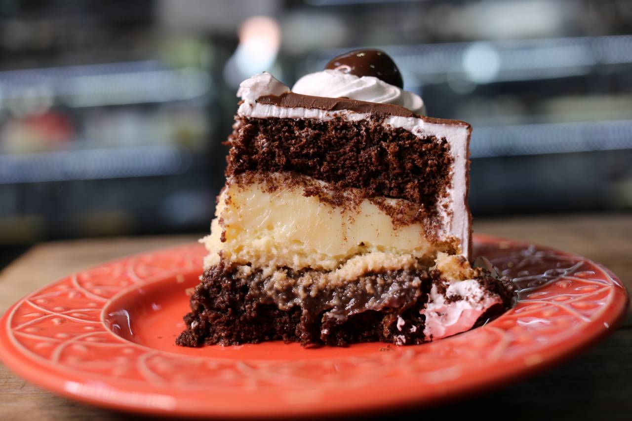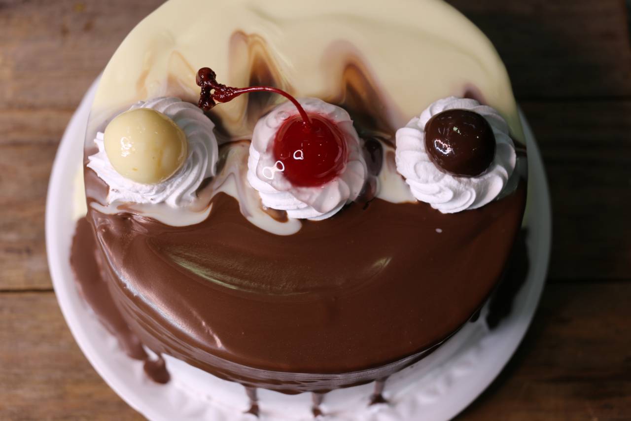 Torta de massa de chocolate com recheio de chocolate branco e preto.