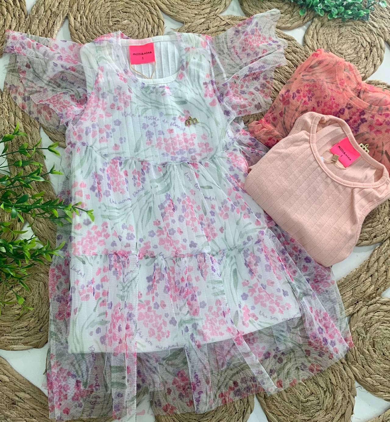 Vestido Infantil Florido com detalhe em tule.