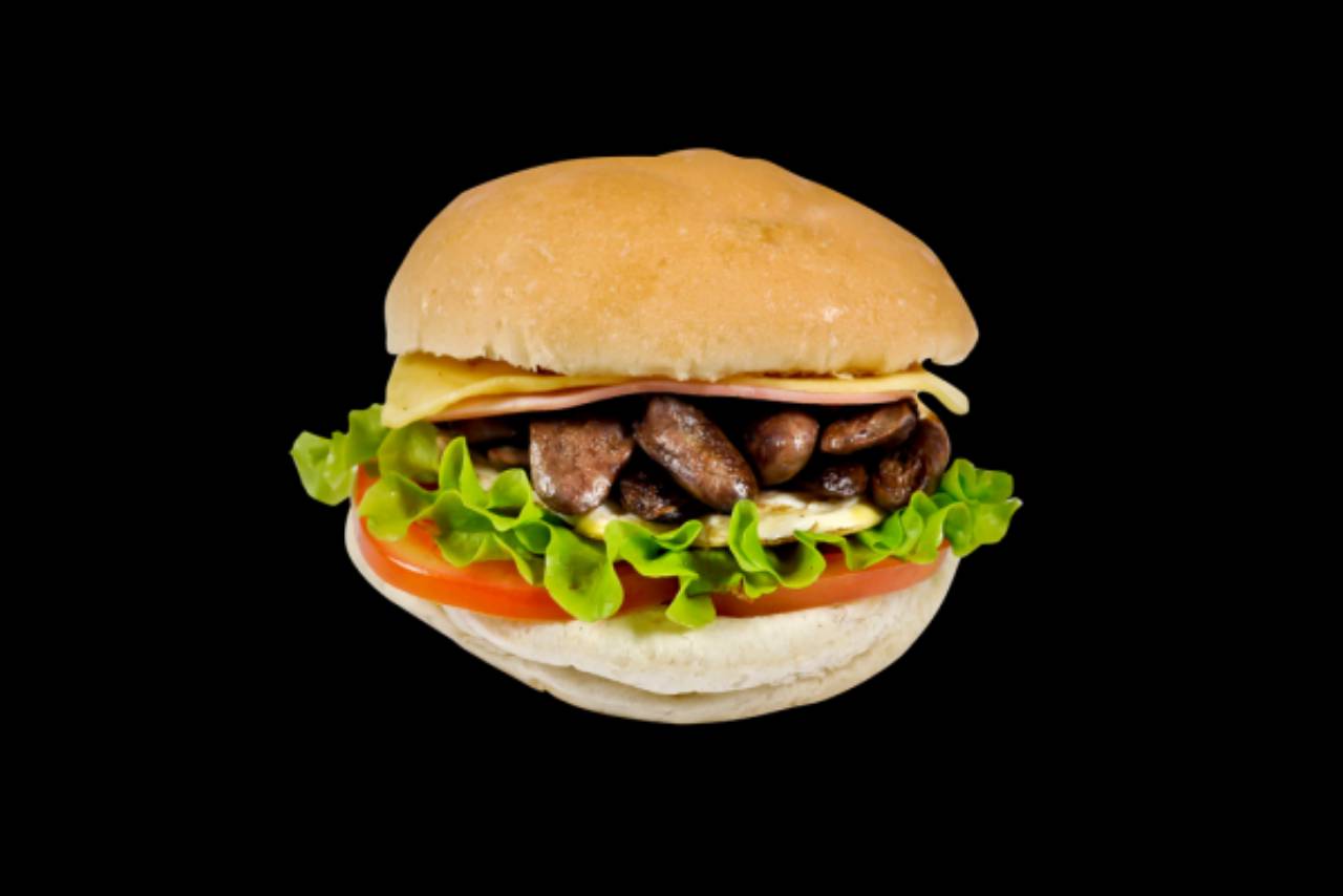 Coração, alface, tomate, presunto, queijo e maionese.