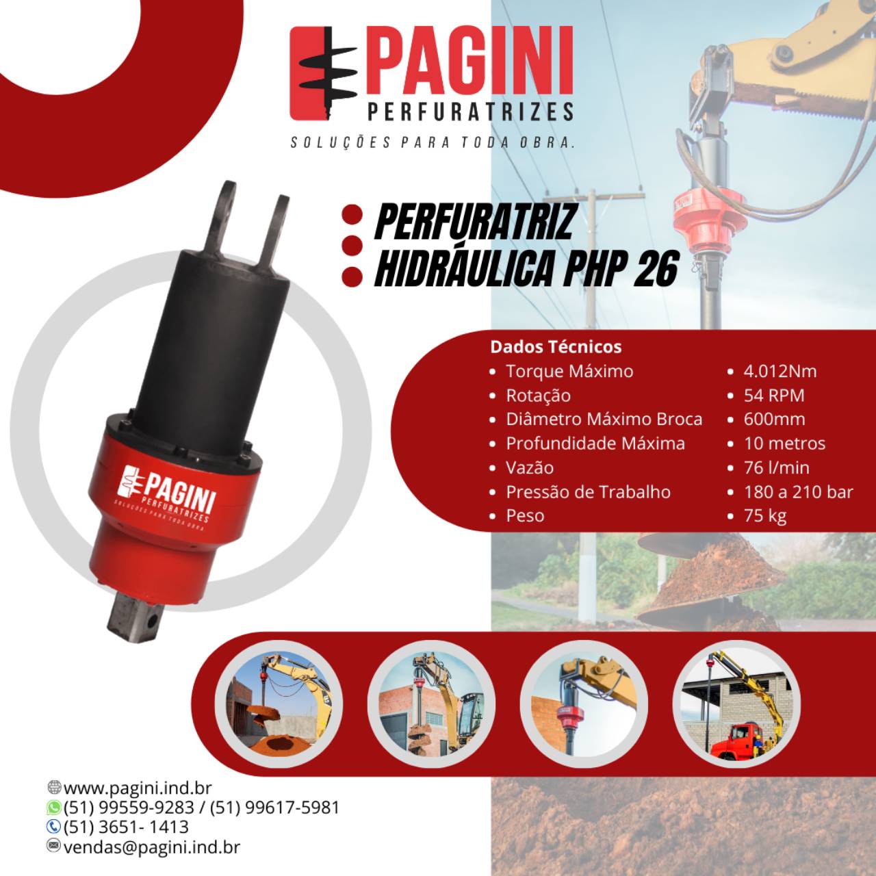 É indicado para ser utilizado em guindastes, retroescavadeiras, escavadeiras, mini escavadeiras e mini carregadeiras. Os diâmetros de brocas podem variar de 100mm a 600mm e a profundidade máxima de até 10metros.
