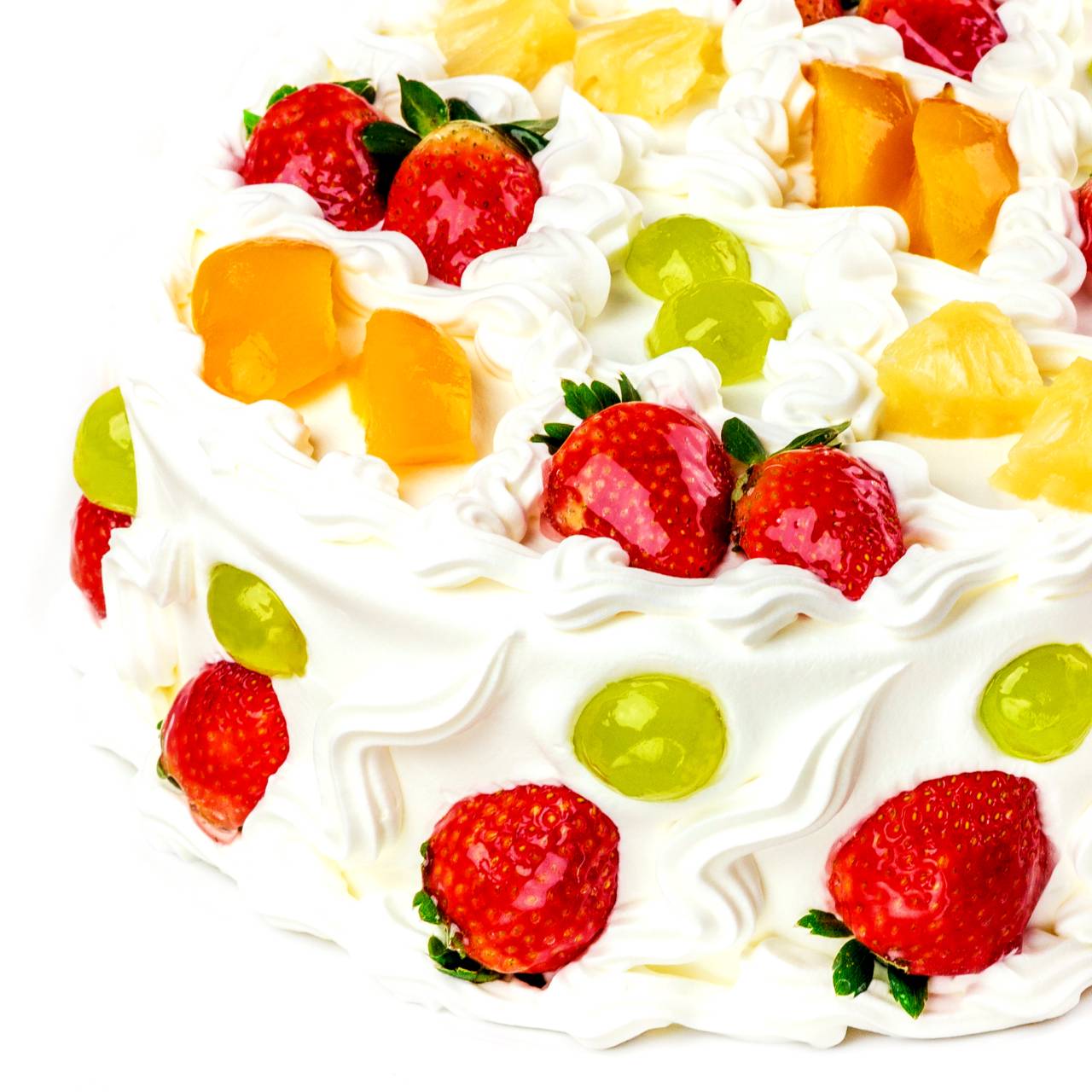 Massa de pão de ló tradicional, recheado com morango, uva, pêssego, abacaxi, suspiro e nata. Coberto com chantilly e decorado com as frutas do recheio.