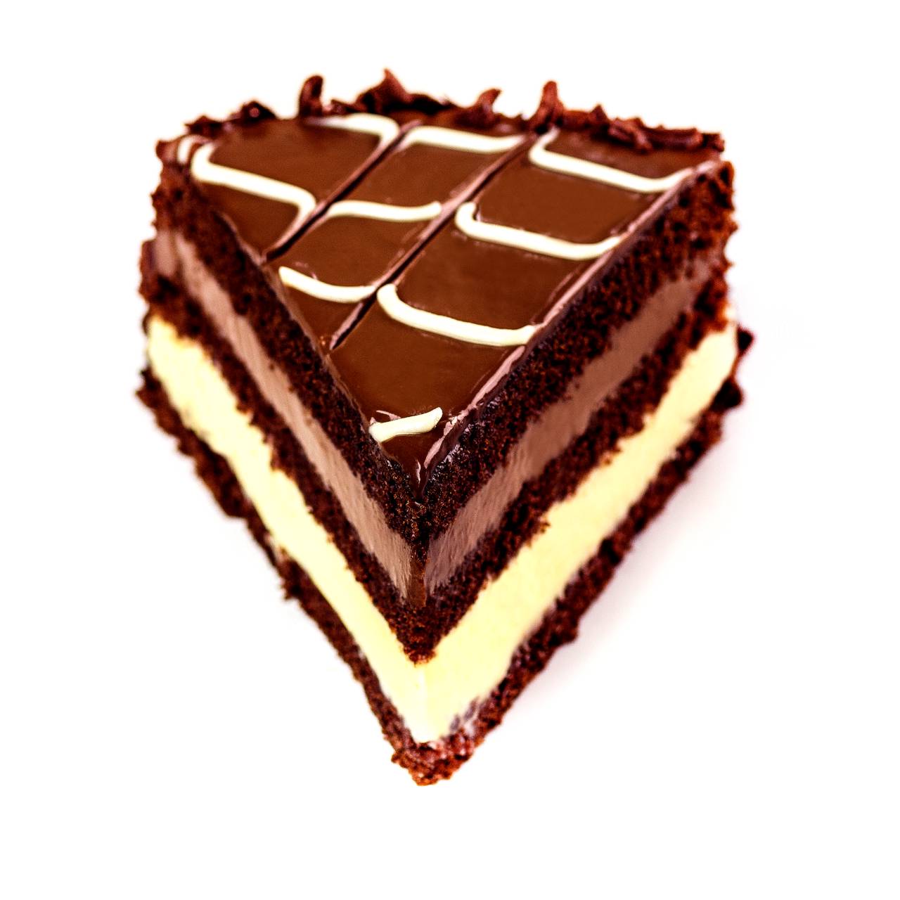 Massa de pão de ló com chocolate. Uma camada de recheio com ganache de chocolate branco e outra de ganache de chocolate ao leite. Coberto com ganache de chocolate ao leite e decorado com ganache de chocolate branco e raspas de chocolate ao leite.