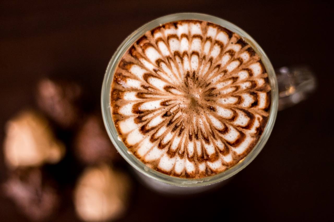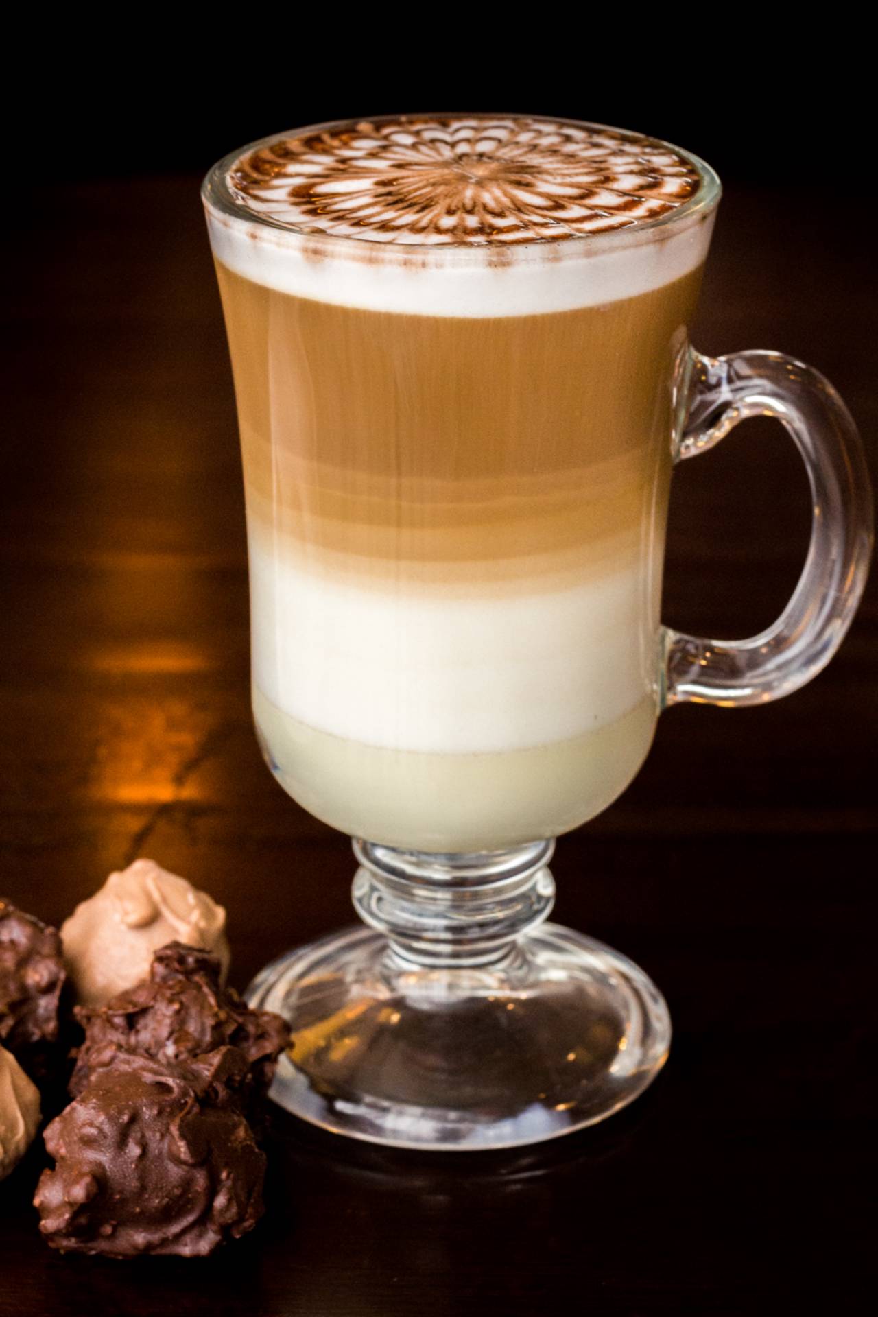 Base de leite condensado, com leite vaporizado e café espresso. Finalizado com crema do leite e calda chocolate.