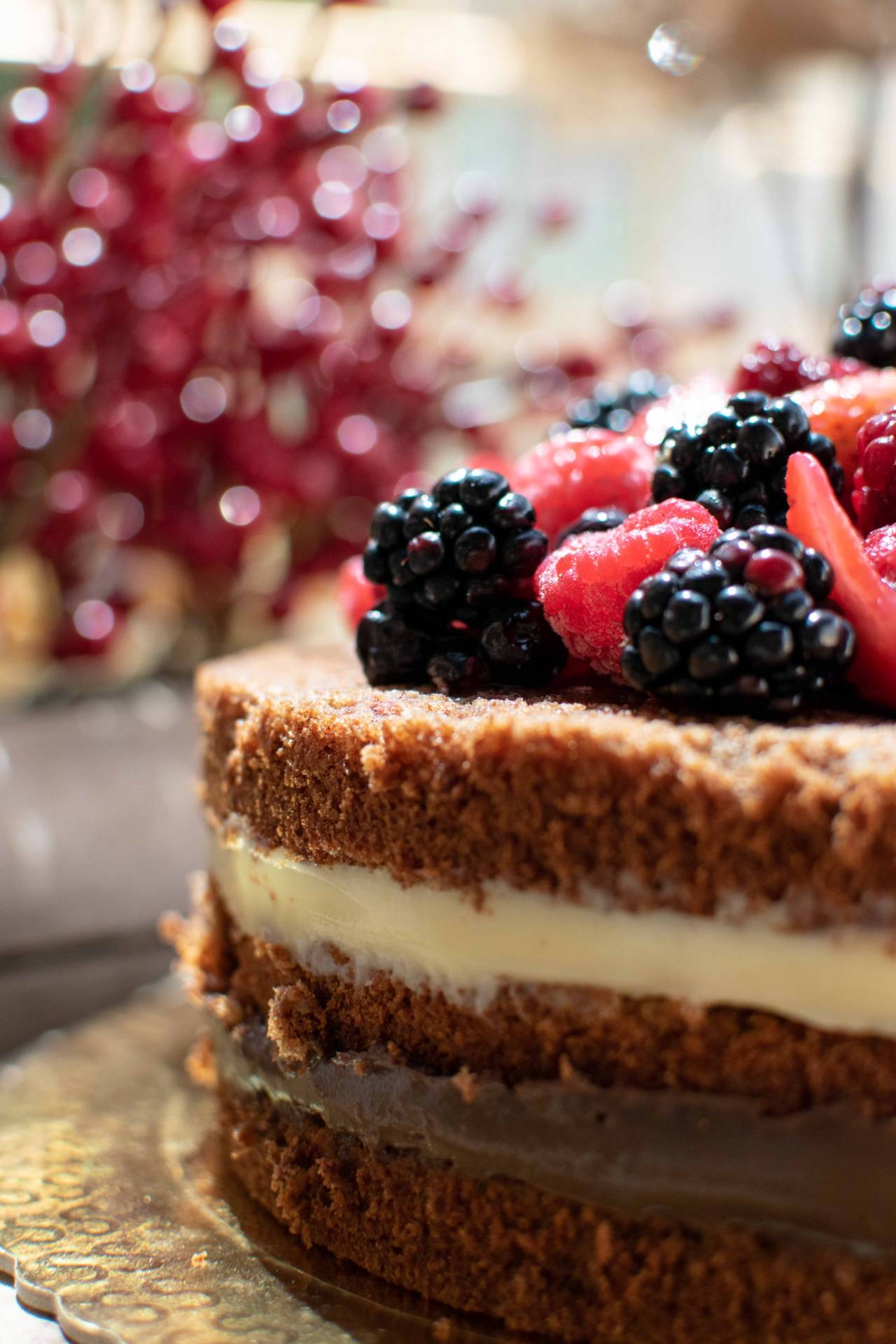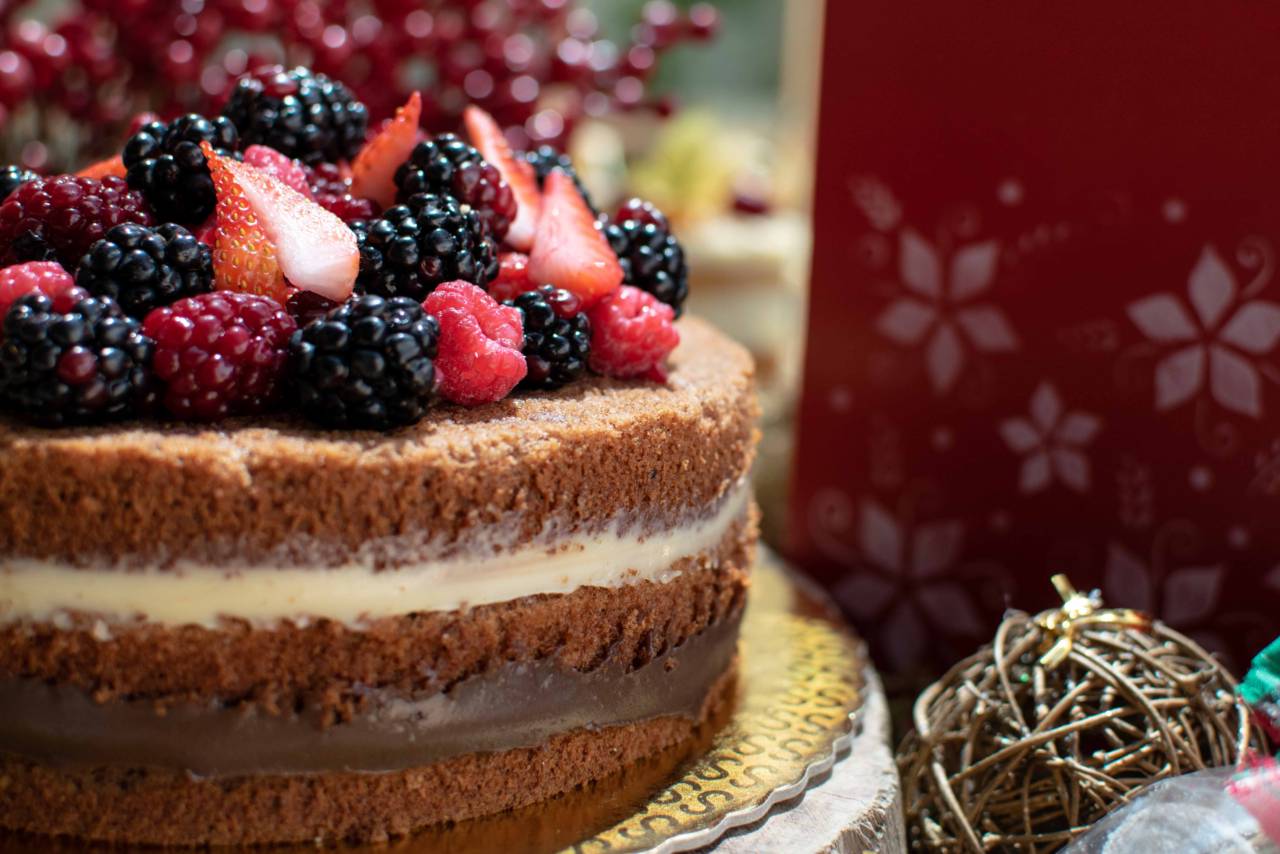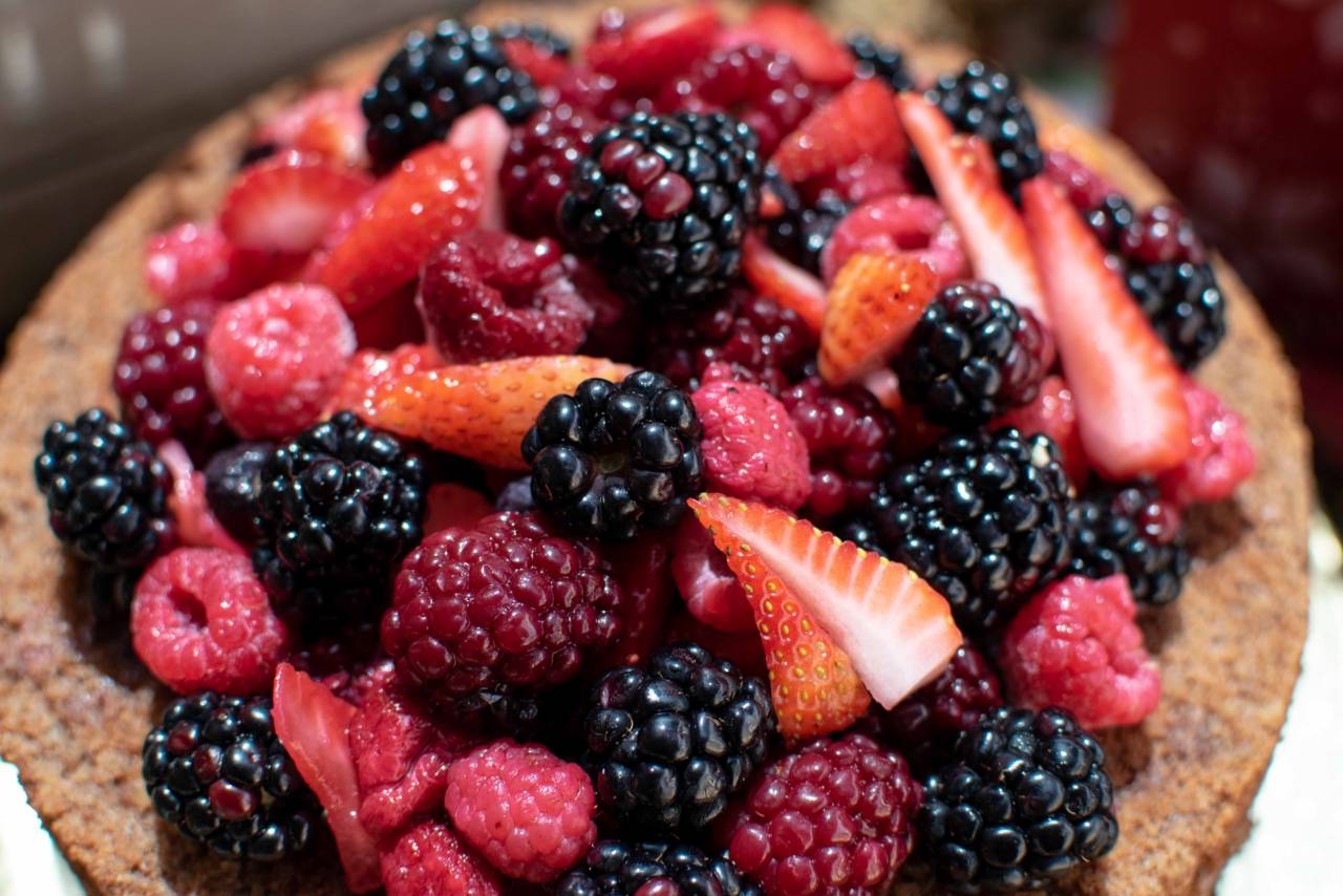 Zaza - massa de biscuit com chocolate e nozes, brigadeiro branco e preto e frutas vermelhas - Sem glúten -