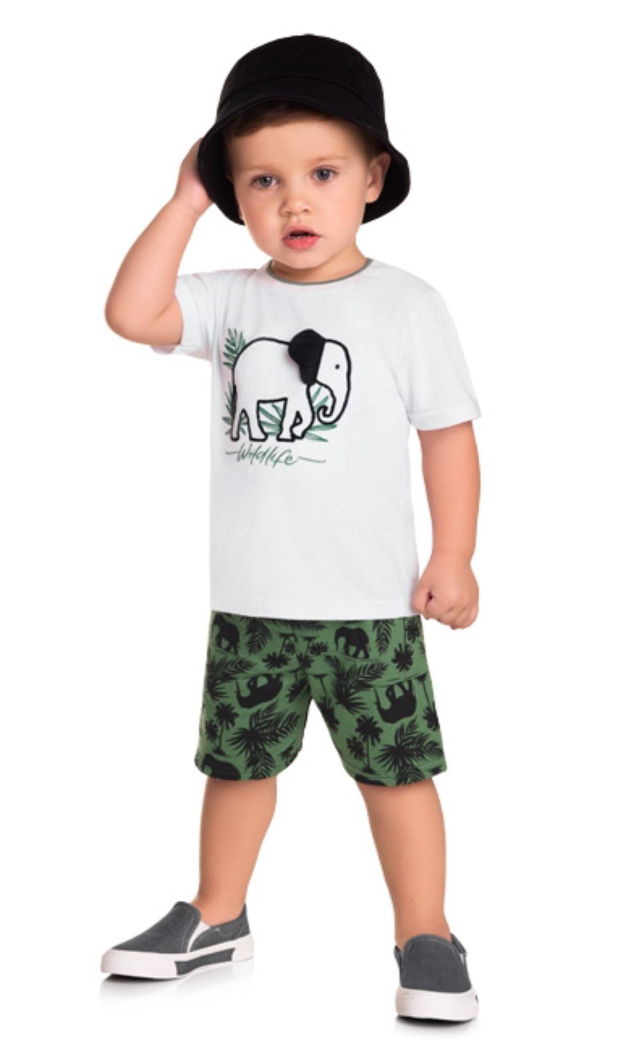 CONJUNTO COM CAMISA ESTAMPA ELEFANTE, COM DESTAQUE NA ORELHINHA. TAMANHOS G/6/8, MARCA KYLY.