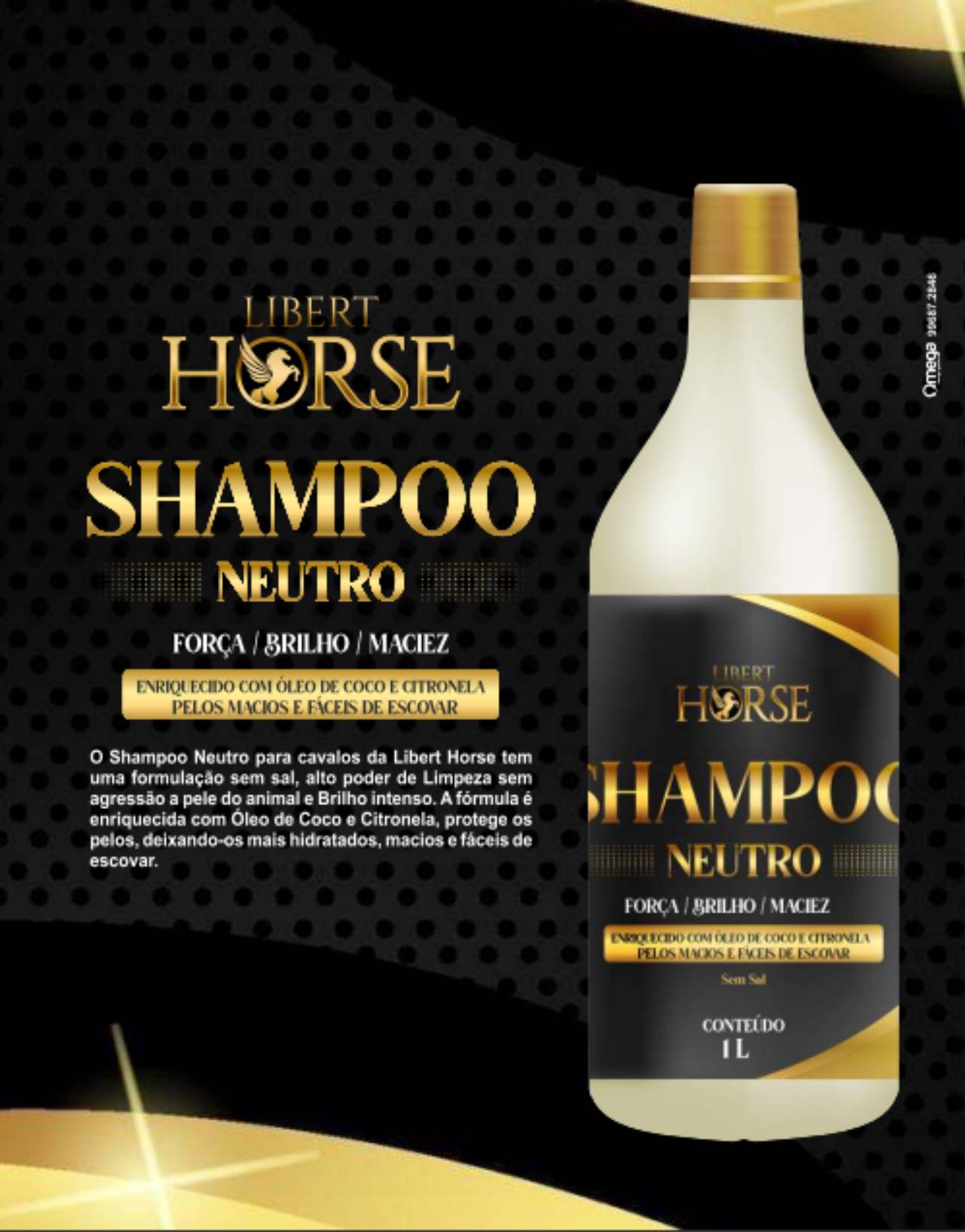 O Shampoo Neutro para cavalos da Libert Horse tem uma formulação sem sal, alto poder de limpeza sem agressão a pele do animal e brilho intenso. A fórmula é enriquecida com Óleo de Coco e Citronela, protege os pelos, deixando-os mais hidratados, macios e fáceis de escovar.