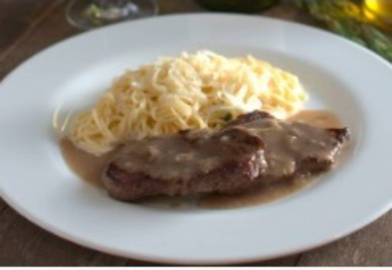 Escalope de Mignon ao Molho Demi Glace acompanhado com Capellini na Manteiga de Sálvia.