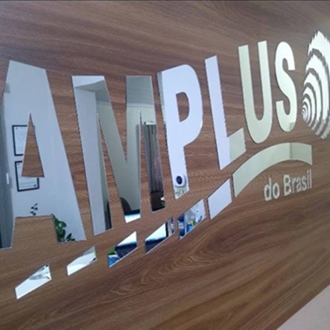 Fachada em acrílico feita em acrílico branco, com letras recortadas a laser e coladas – assim como a imagem central, e com iluminação interna. Placa para fachada recortada via máquina de corte a laser – personalizada com adesivo espelhado que dá a ideia de movimento à peça.