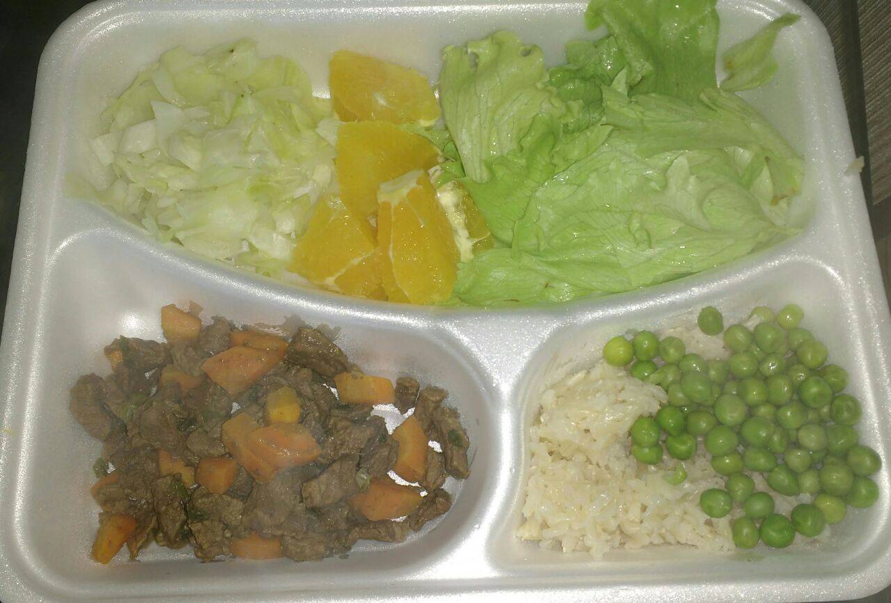 Almoço Fitness, Arroz integral carne de Panela Picadinha, Legumes e Salada.