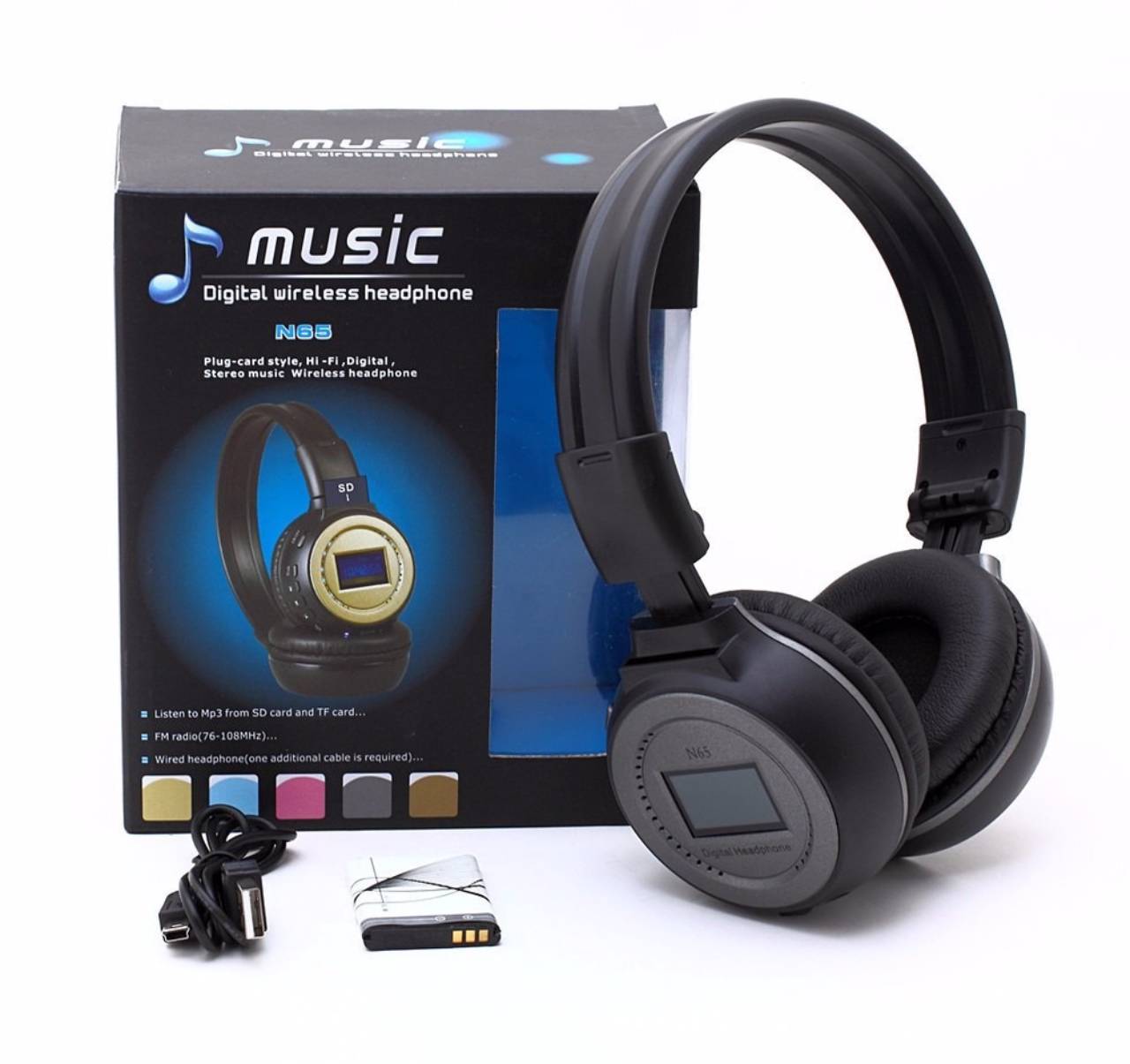 OutrosFone de Ouvido Bluetooth Sem Fio com Visor FM e Cartão de Memória Boas BQ-N65 - Dourado Escute músicas com qualidade direto do seu cartão de memória. Ideal para a prática de esportes, já que não possui fio e tem encaixe perfeito. Leve, prático e dobrável, pode ser guardado e transportado com muita facilidade. Sua espuma diminui a pressão sobre os ouvidos, elimina a interferência de ruídos externos, garantindo a qualidade do áudio e conforto por muito tempo. *CARTÃO DE MEMÓRIA NÃO INCLUSO Especificações Técnicas: Compatível com formatos: MP3, WMA, WAV Frequência do receptor: 76 até 108 Mhz Relação S/N: >90dB THD: <1% Frequência de resposta: 20 Hz ~ 20 KHz Bateria recarregável Mais de 8 horas de uso sem precisar recarregar Tempo de carregamento: 2:30 horas Display em LCD Itens Inclusos 1x Fone de Ouvido Bluetooth Boas N65 1x Cabo carregador USB