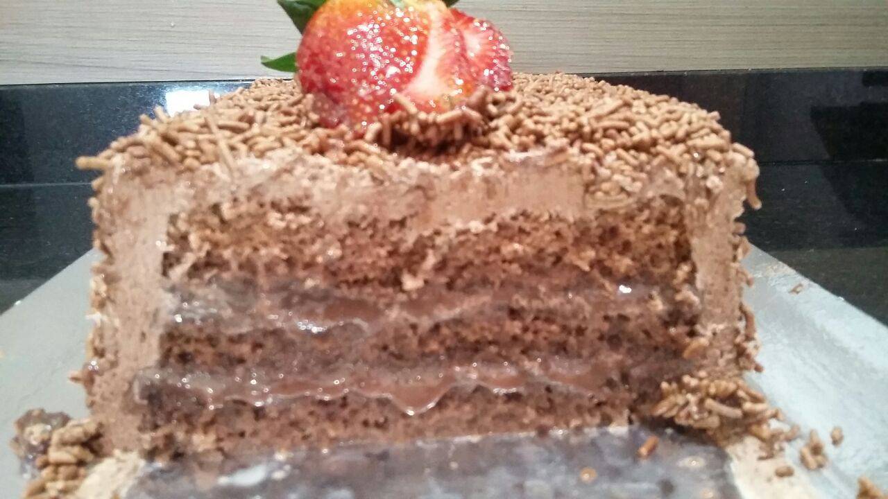 Bolo de brigadeiro: Massa de Chocolate de Pão de ló Recheio: Brigadeiro Cobertura: Chantily com granulado