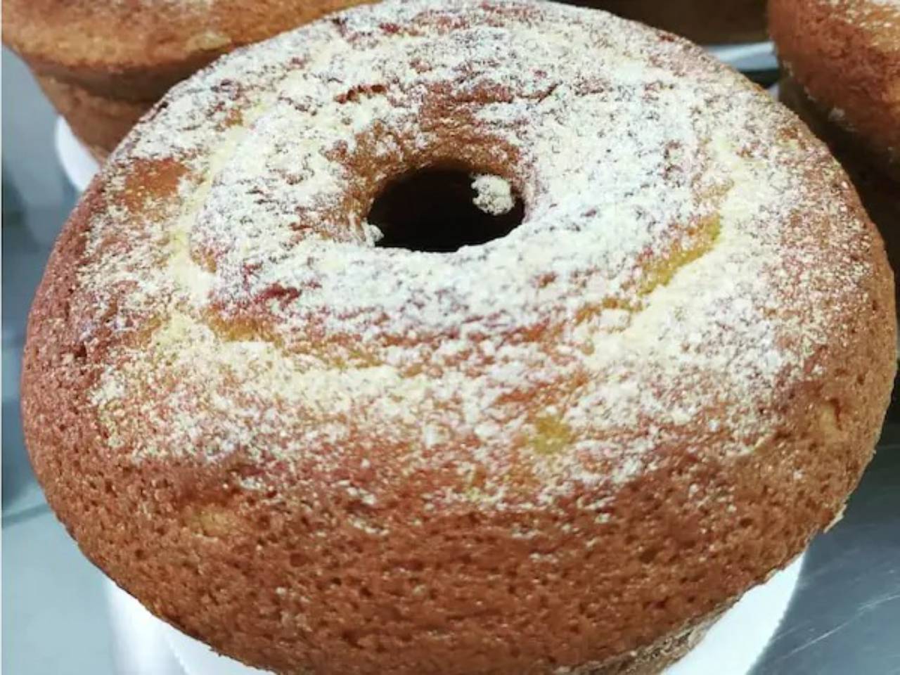 Bolo de fubá. Tamanho médio. Pesa aproximadamente 500g, e serve em média 8 fatias.