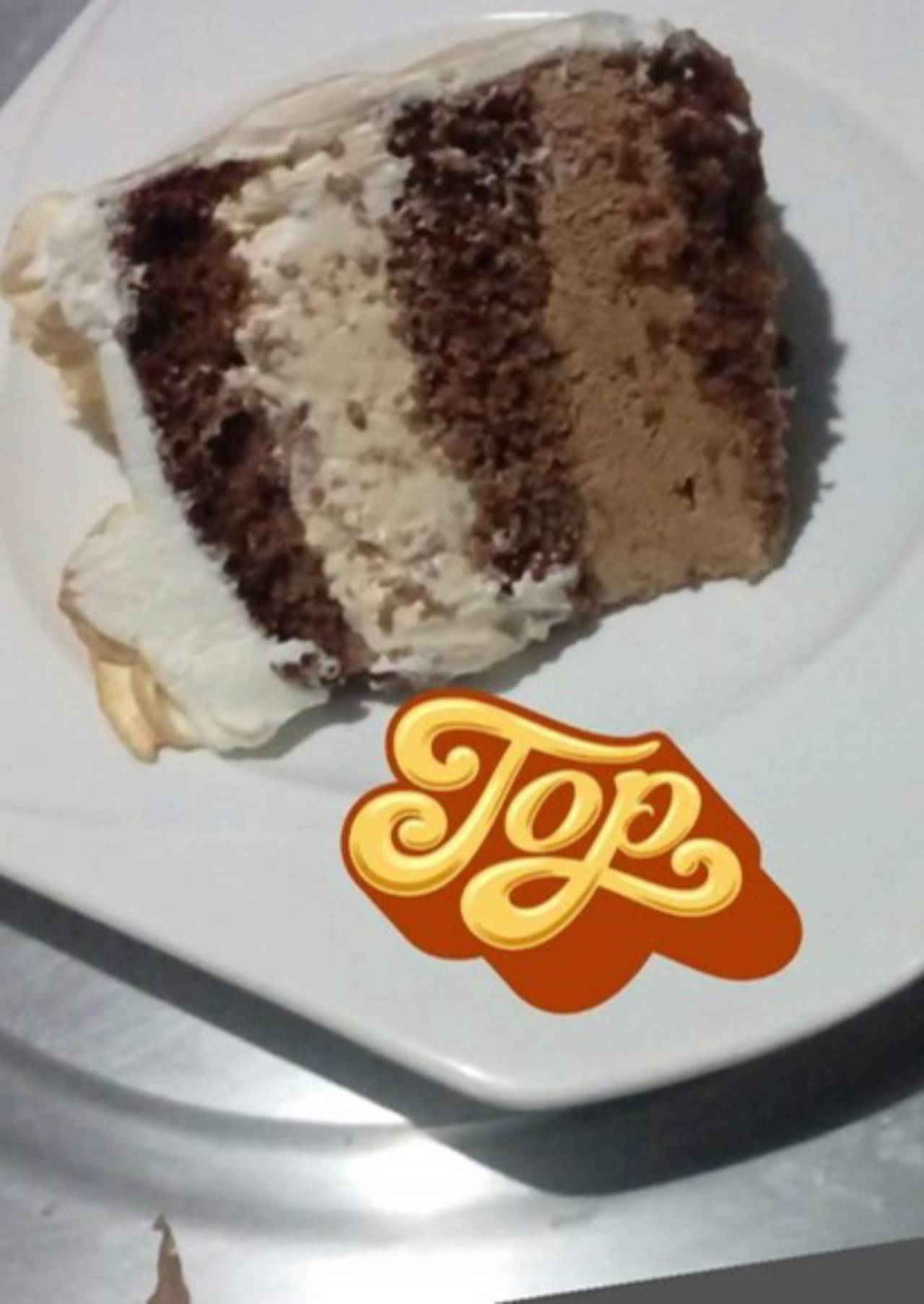 Massa de pão de ló branca com mousse de chocolate e mousse de doce de leite. Coberto com chantilly