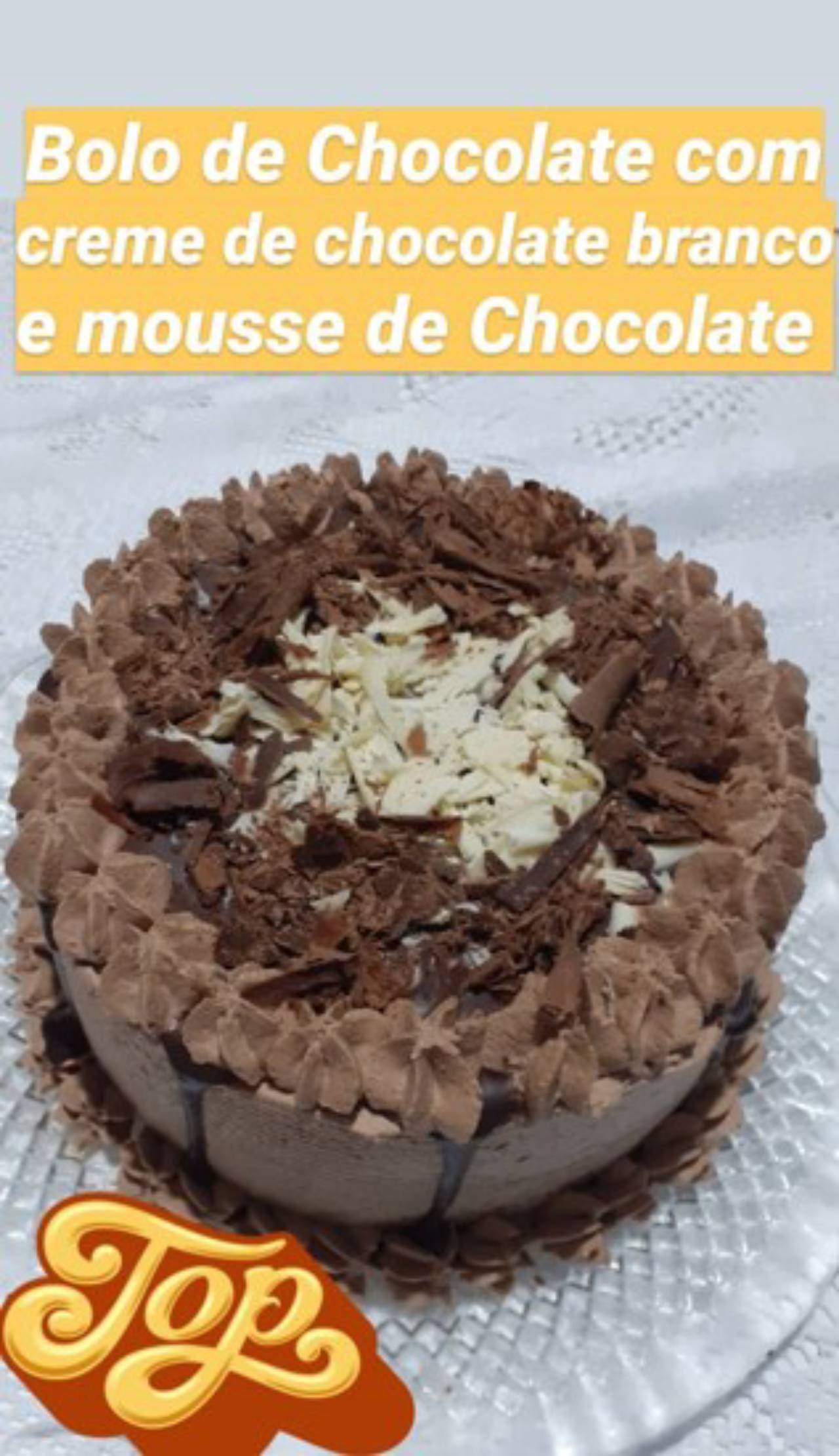 Massa de chocolate com recheio de mousse de chocolate meio amargo e mousse de chocolate branco. Coberto de raspa de chocolate branco e ao leite com chantilly de chocolate e calda de chocolate.
