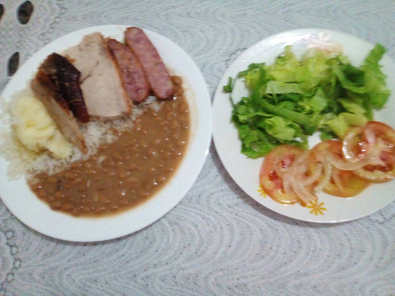 Arroz, Feijão, Pernil Assado, Linguiça Assada e Purê de Batata