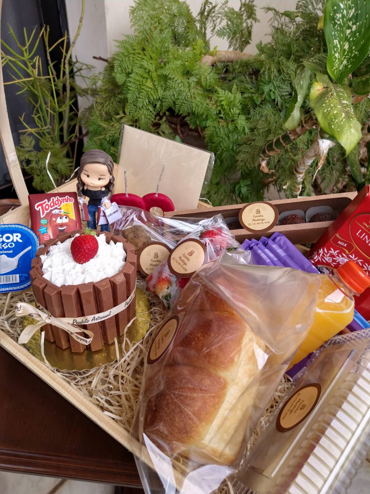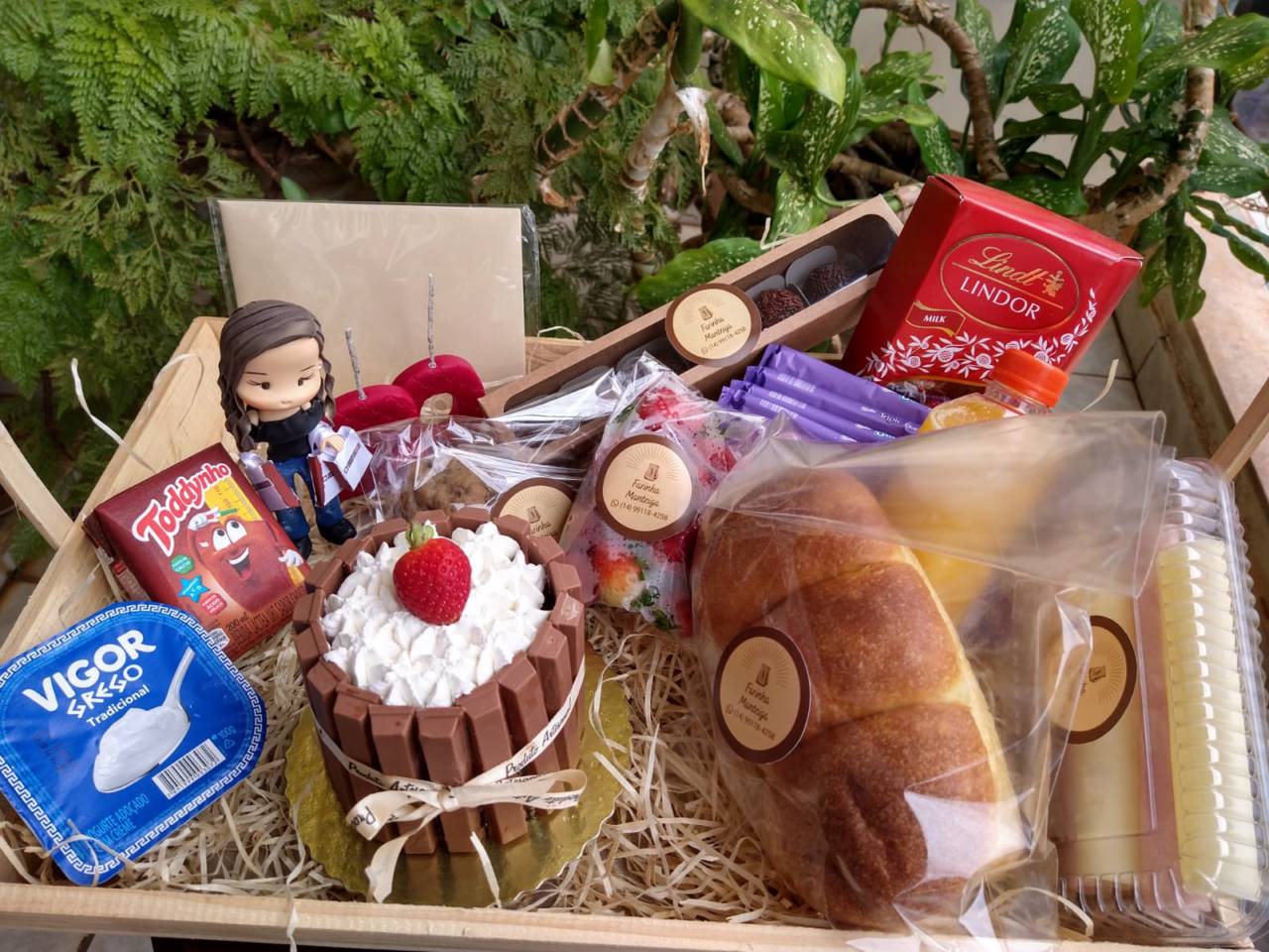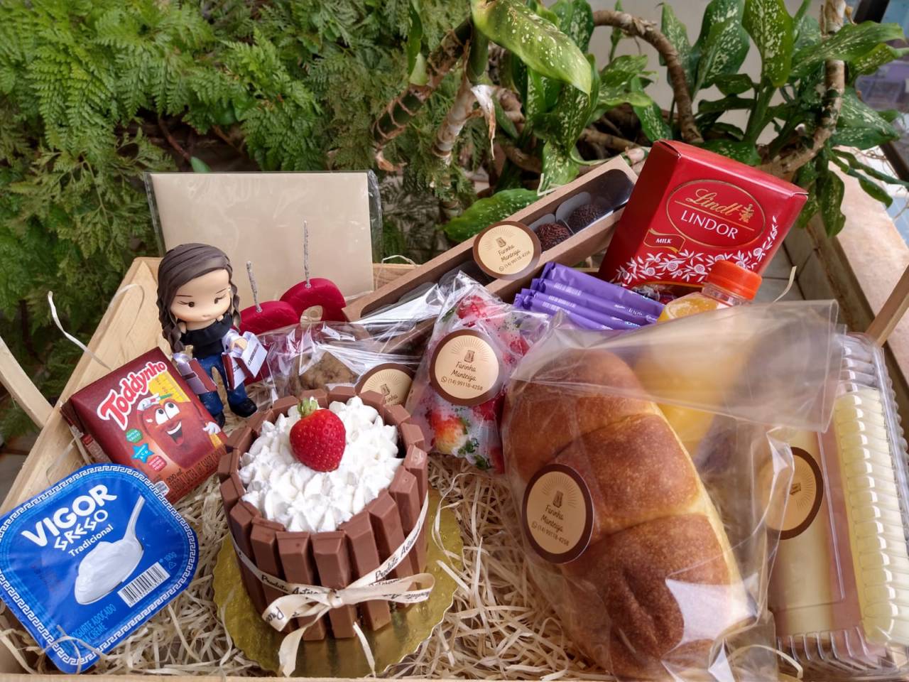 As cestas são personalizadas, de acordo com a preferência do cliente. Nas cestas são colocadas as delícias que o cliente preferir!! Normalmente é sugerido alguns itens, dependendo da ocasião. Geralmente, sugerimos pão (focaccia ou brioche), fruta da estação, cookies, Yogurt, bebida. Caso seja de aniversário, podemos adicionar um mini bolo. Tudo de acordo com a sua preferência.