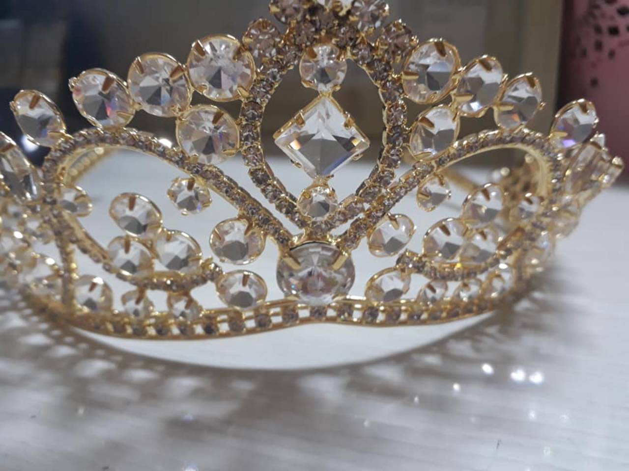 Coroa media na cor dourada com pedrarias.