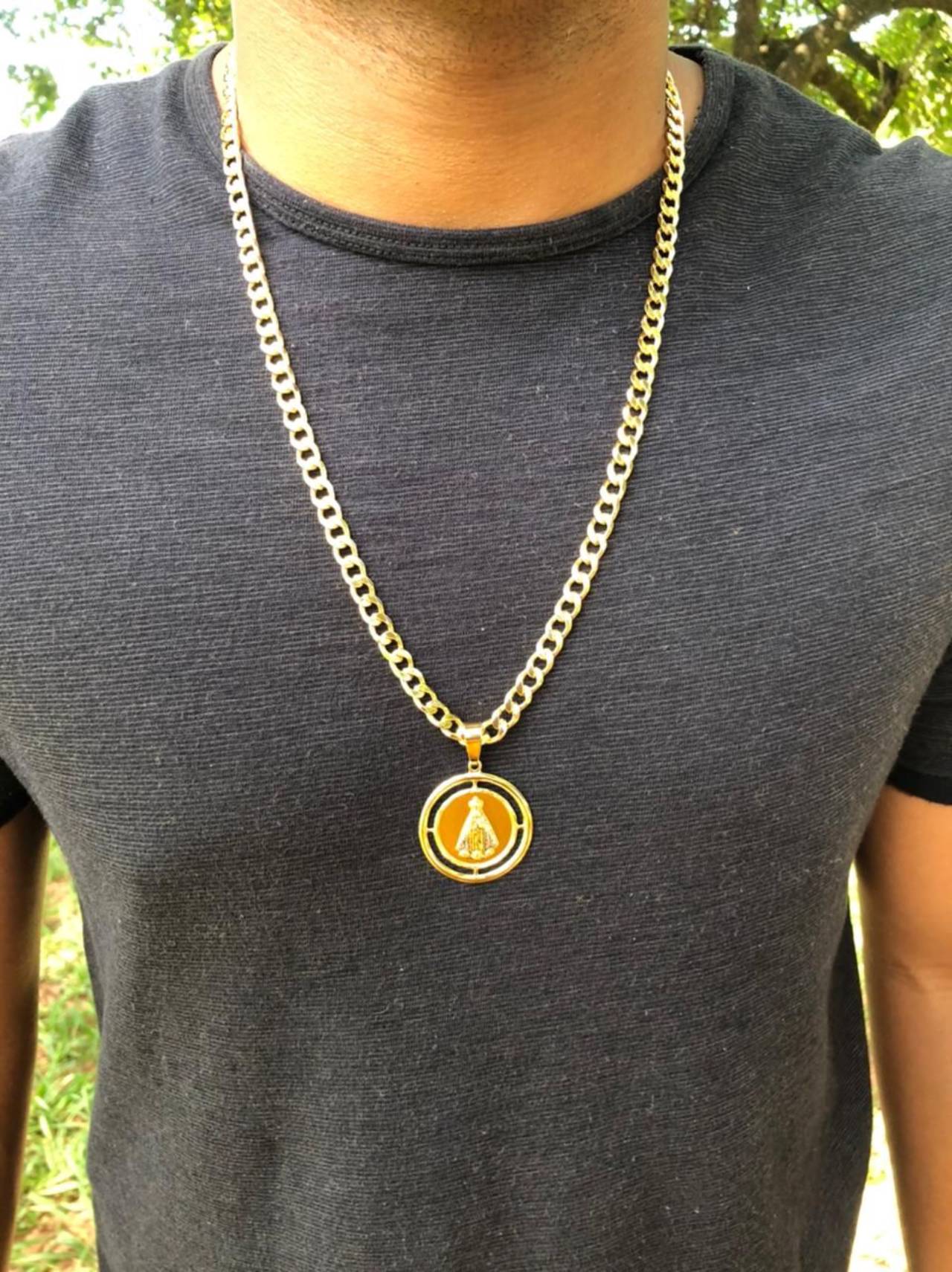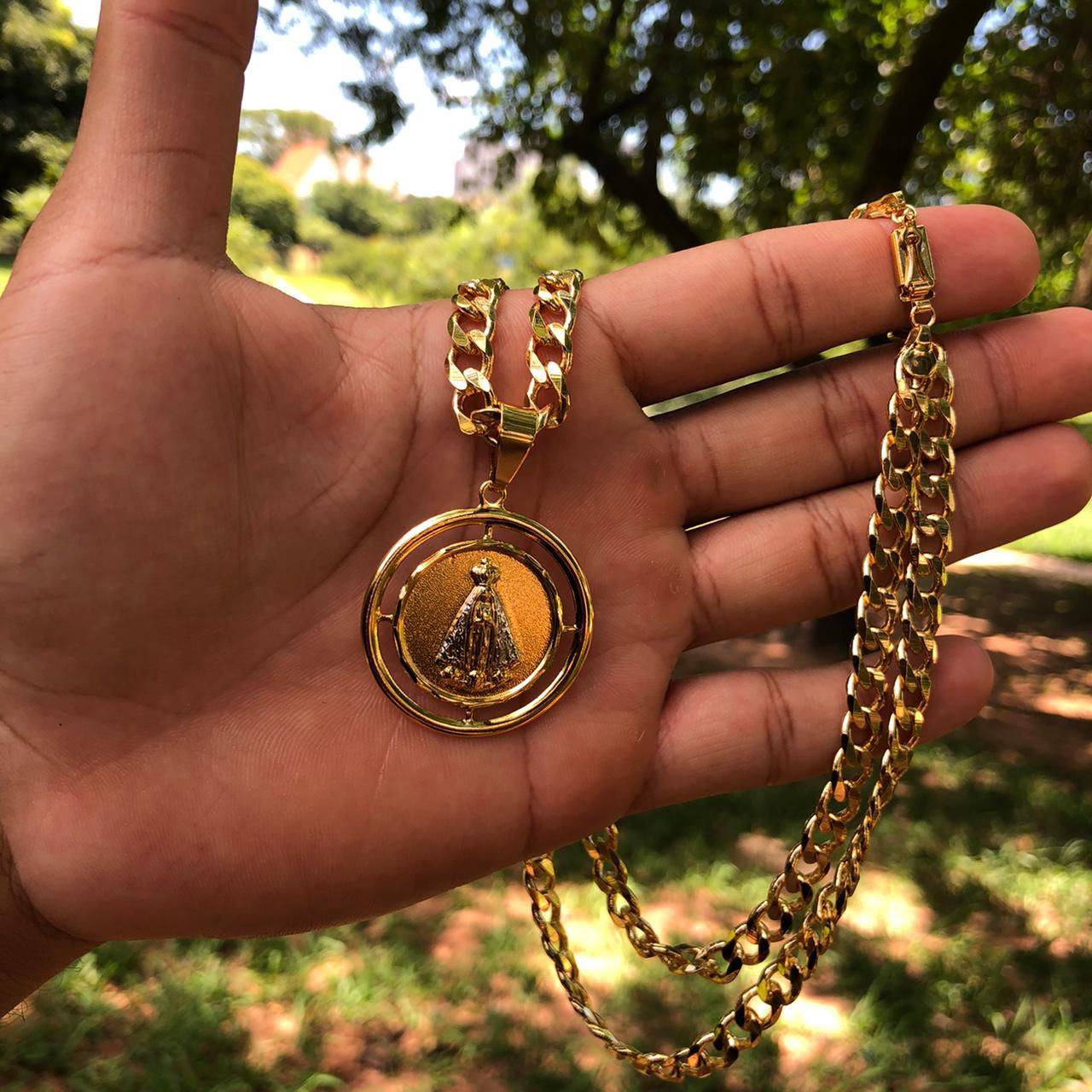 Corrente Grumet Diamantada com pingente "Nossa senhora Aparecida " 7mm 70cm. Conjunto Corrente e Pulseira Grumet Diamantada por apenas 450,00. Pulseira 179,99. As peças são banhadas á Ouro 18K.