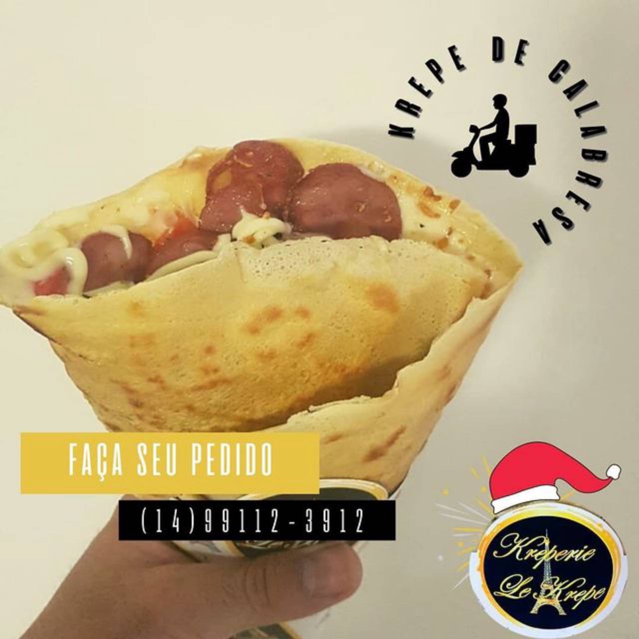 O Crepe de Calabresa da Kreperie Le Krepe é recheado com Calabresa, muçarela, tomate, cebola, orégano, pimenta biquinho, alho crocante e catupiry para finalizar. A massa macia e crocante envolve todo o recheio, deixando o crepe ainda mais saboroso.