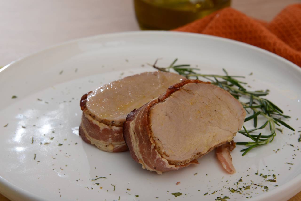 Filé mignon suíno enrolado com bacon